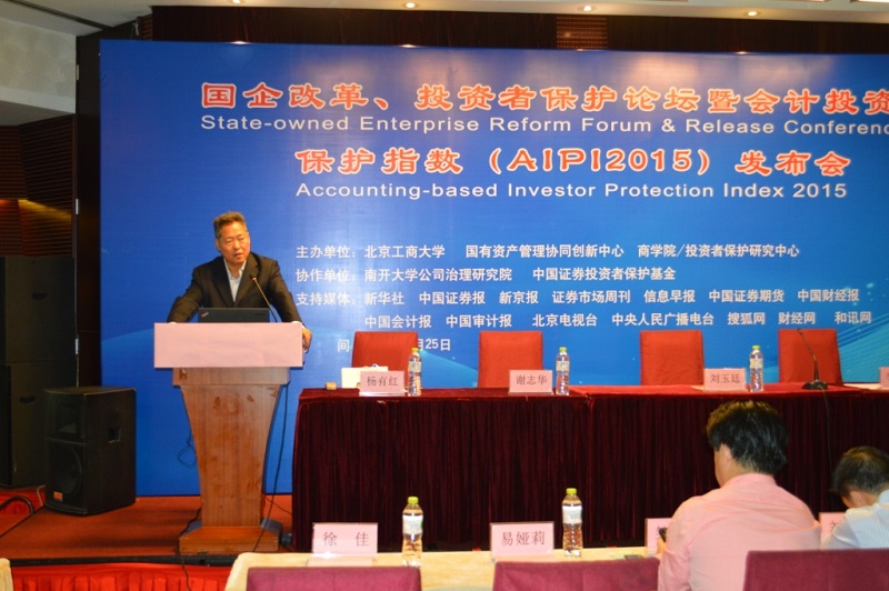 9月25日,我校召開中國上市公司投資者保護論壇暨會計投資者保護指數(AIPI2015)發布會,第六次發布該指數。財政部會計司、企業司原司長劉玉廷,中國企業財務管理協會副會長李永延,中國社會科學院財經戰略研究院院長高培勇,我校副校長謝志華出席發布會并作主題演講。《中國證券報》、《會計研究》等在京媒體及專業期刊、上市公司及投資機構代表、在京高校和科研機構代表以及商學院部分教師和學生共計100余人參加了發布會。發布會由科技處處長楊有紅主持。