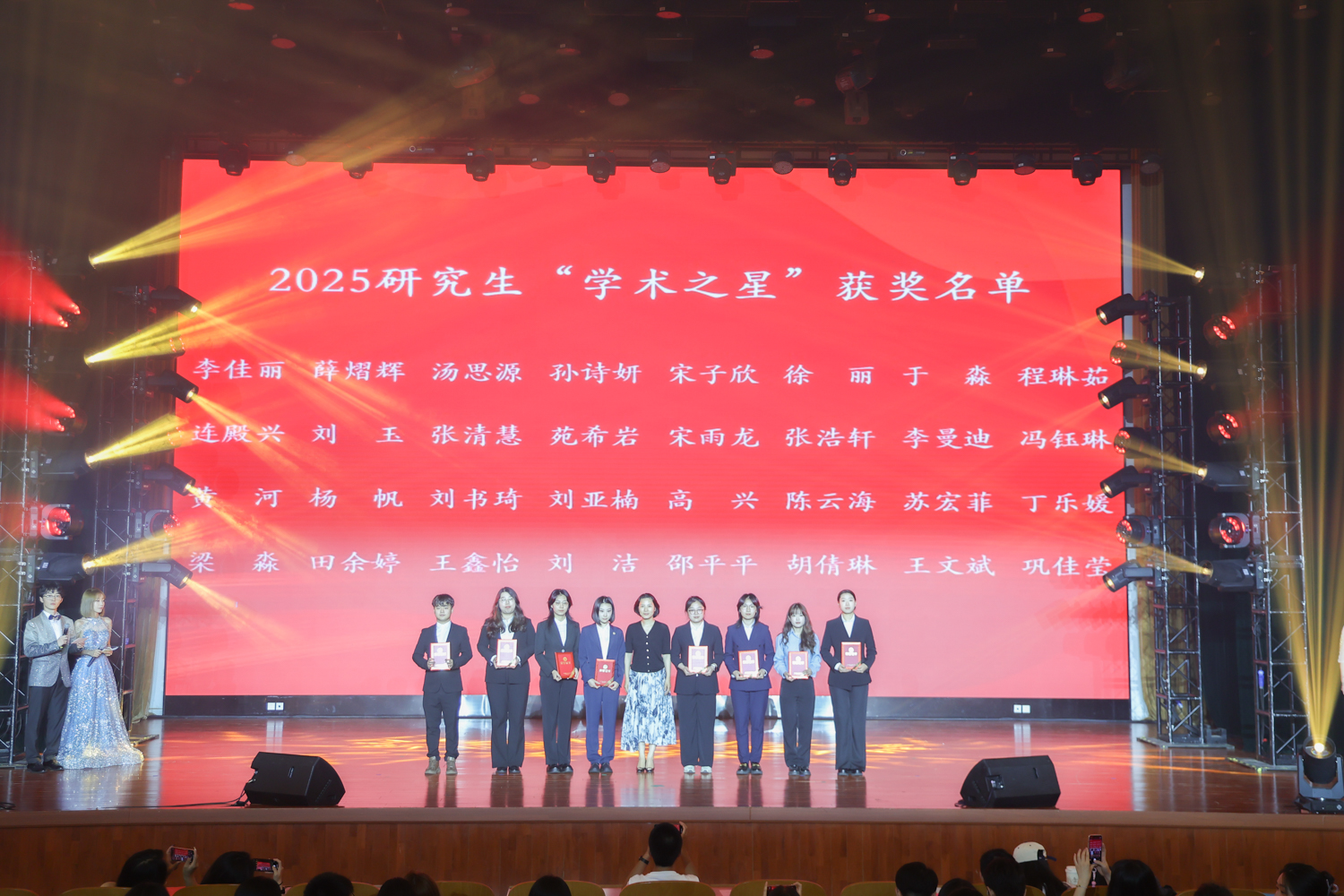第二篇章“韶華共渡”邀請了2020—2024屆研究生會主席團成員以朗誦的形式追憶校園生活、表達美好祝愿,讓觀眾又驚喜又感動;歌曲聯唱中三首膾炙人口的歌曲引發全場大合唱;舞蹈《Breathe in》充滿青春正能量;并對研究生“學術之星”進行頒獎表彰。