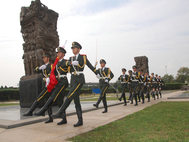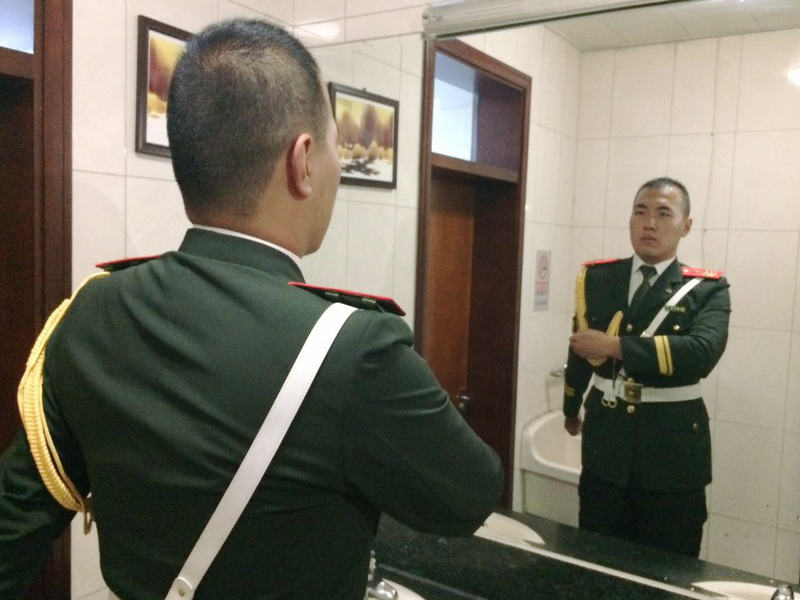 此次活動恰逢抗日戰爭暨世界反法西斯戰爭勝利70周年以及建國66周年,全國各高校、尤其京內高校都非常重視,并進行了充分的準備。我校國旗護衛隊剛剛在9月北京高校國旗儀仗比賽中榮獲二等獎的歷史最好成績后,隊員們以更加飽滿的熱情投入賽前準備。在不耽誤正常上課的前提下,護衛隊充分利用每天早晨6:00~7:30、晚上9:00~10:30和周末的時間訓練,反復強化每一個流程,細摳每一個動作。有的隊員除了正常訓練時間外還會對著鏡子加練,直到動作規范為止。經過連續集訓,大部分隊員腳上磨出了血泡,但為了全隊的榮譽,沒有一名隊員缺席訓練。正像護衛隊隊長所說的,在國旗護衛隊中,堅持就是一種幸福!