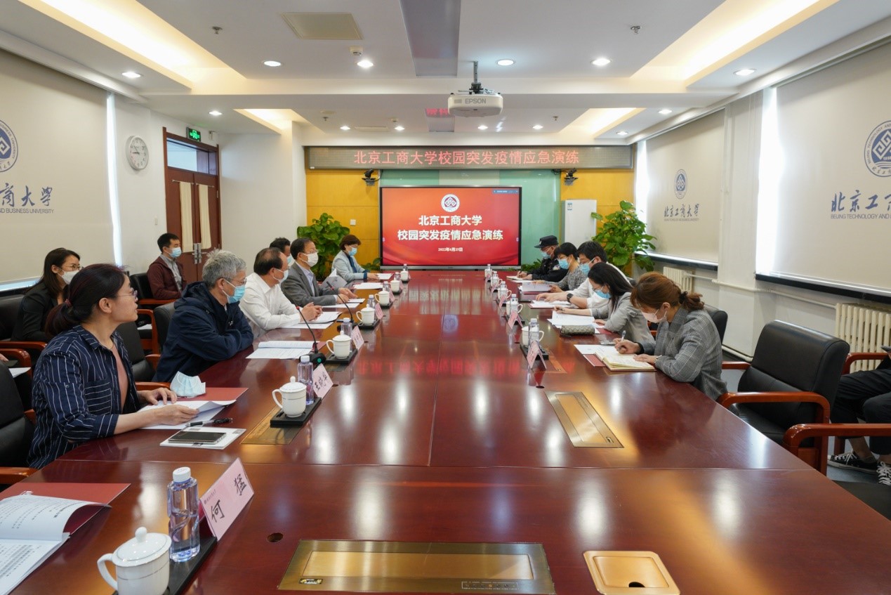 面對嚴峻復雜的疫情形勢,我校編制了《北京工商大學突發新冠肺炎疫情應急處置預案》,并多次進行桌面推演。本次實戰演練以我校一學生接到屬地疾控中心電話,反饋其核酸檢測呈陽性為背景展開,共設計信息上報及指令下達、校園封閉及所在樓宇封閉、信息流調、疫情研判、環境消殺、網格化管理、全員核酸檢測等七個場景。接到疫情報告后,李中奇宣布演練開始。
