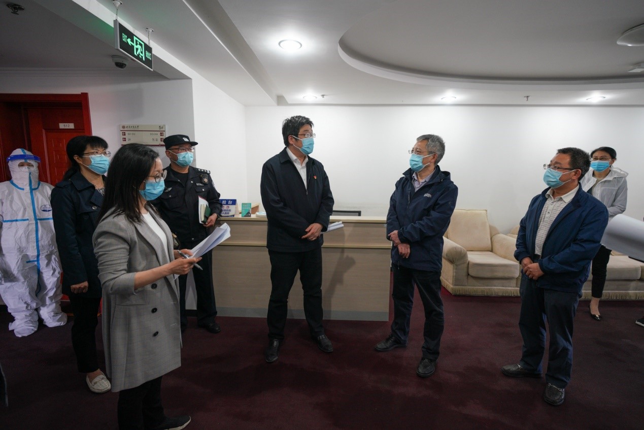 在隔離點,校醫院醫護人員指導初判密接人員進行抗原自測,等待自測結果。鄭洋副主任對隔離醫學觀察點“三區兩通道”設置及環境布置進行了細致的現場指導。