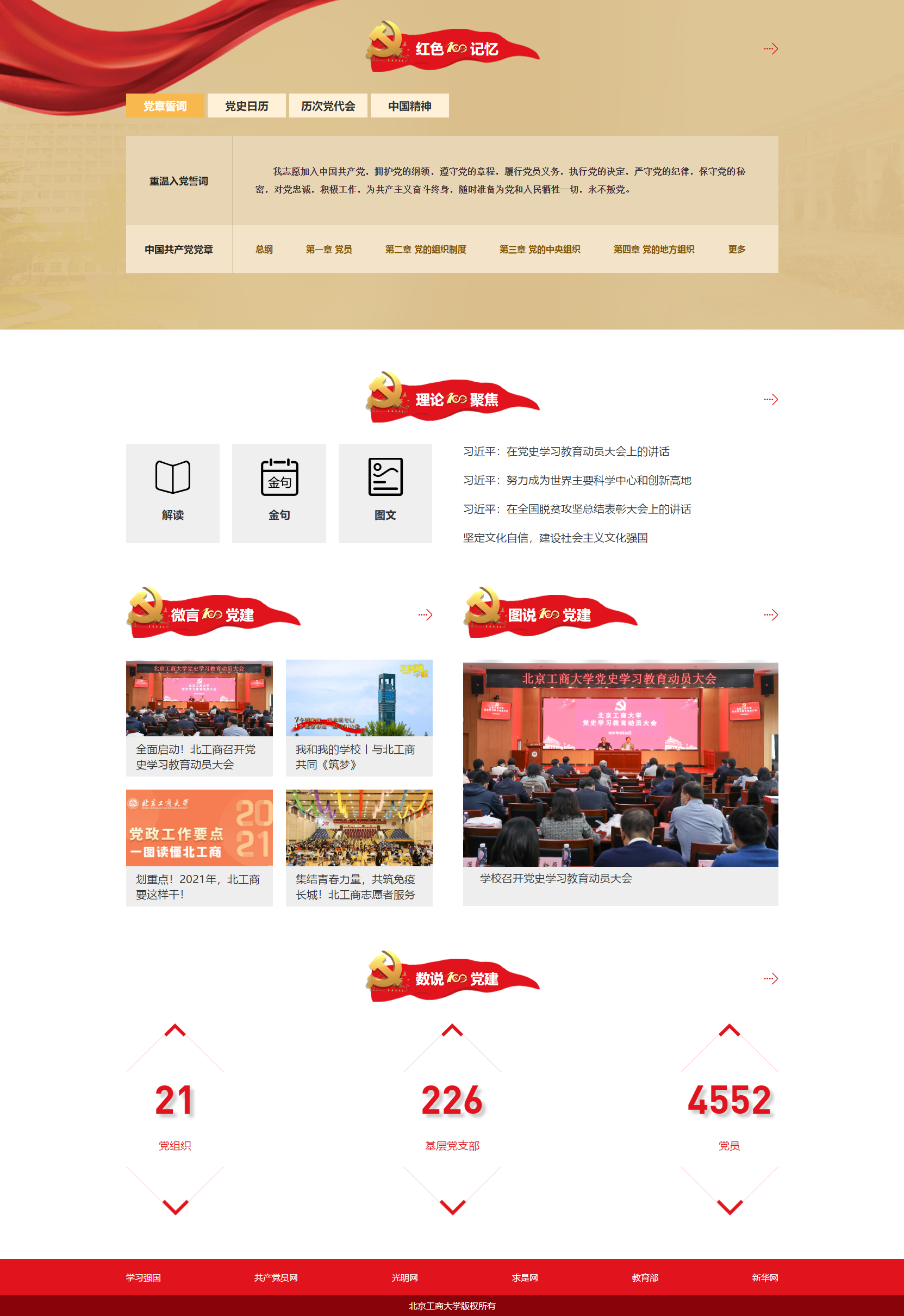 黨建動態欄目集中展示學校黨史學習教育工作動態及黨建工作動態。左側以輪播圖的形式展示黨建活動。永遠跟黨走欄目展示學校“永遠跟黨走”主題教育活動開展情況,及上級關于“永遠跟黨走”主題教育活動相關精神及部署安排。初心使命欄目展示各基層黨支部黨史學習教育動態,發布優秀共產黨員、優秀黨務工作者專題報道。紅色記憶欄目分為黨章誓詞、黨史日歷、歷次黨代會、中國精神四個子欄目,帶領大家重溫入黨誓詞,學習中國共產黨黨章,了解“歷史上的今天”發生的黨史大事、回顧歷次中國共產黨全國代表大會,感悟偉大的中國精神。理論聚焦欄目分為解讀、金句、圖文三個子欄目,發布上級文件精神、習近平總書記重要講話、權威媒體重要評論文章,供廣大師生學習。微言黨建欄目展示學校官方微信發布的黨史學習教育及黨建相關圖文。圖說黨建欄目以圖片形式展現學校黨史學習教育工作及黨建工作情況。數說黨建欄目以數字形式直觀展示學校當前的黨組織、基層黨支部、黨員數量。