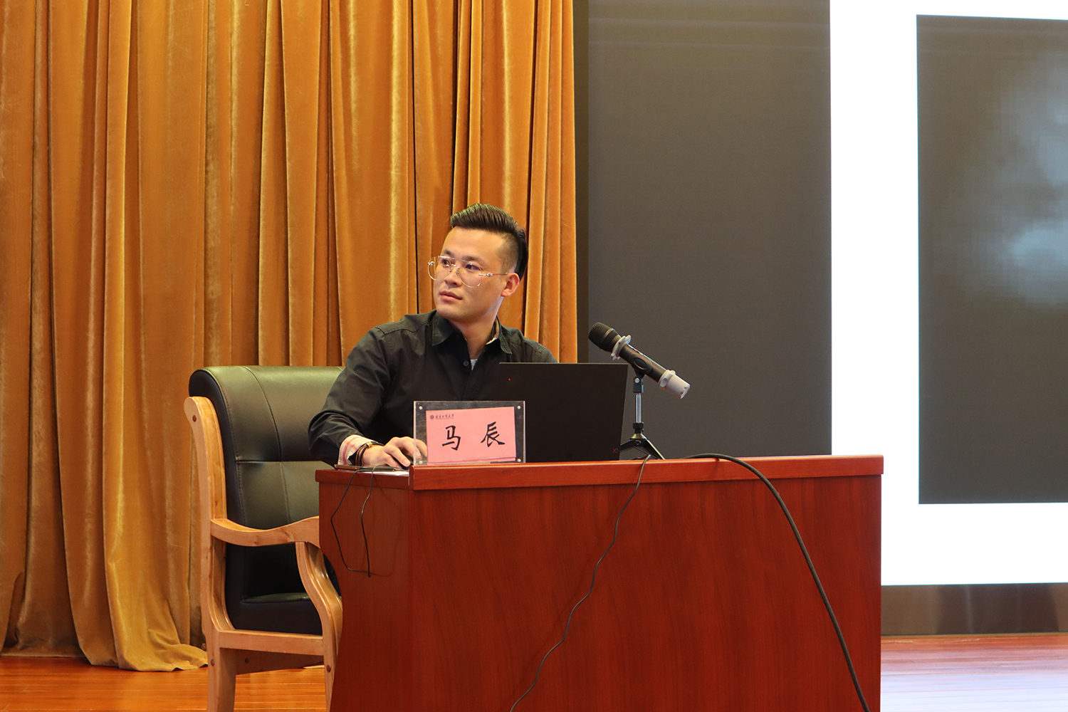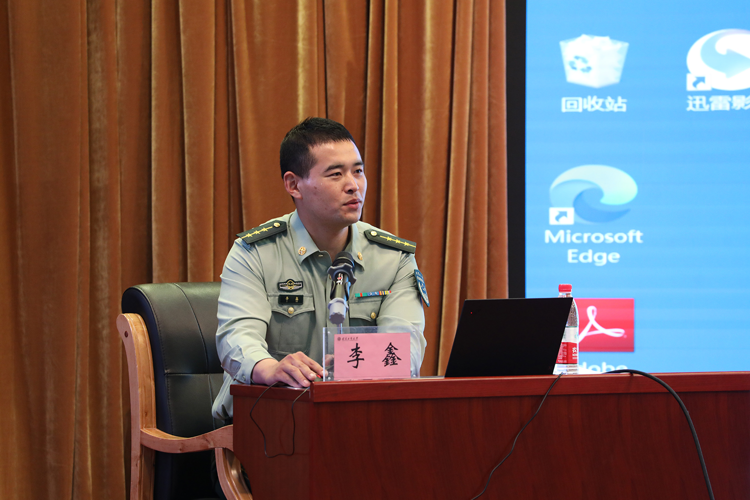 馬辰以中國人民解放軍海軍遼寧艦宣傳片開場,普及了航母的基本知識,馬辰以“中國航母之父”劉華清的一生為縮影,講述了我國航母前期筑基的艱難,中期建設的波折和最終遼寧艦交接入列的成功。他表示,遼寧艦作為第一艘中國自主研發的航空母艦,其順利入列體現了中國海軍綜合作戰力的現代化水平,對于發展遠海合作與應對非傳統安全威脅以及促進世界和平與共同發展具有著重要的意義。馬辰還向在座同學介紹遼寧艦內部生活的點點滴滴,他表示,遼寧艦的生活既充實又踏實,在生活上,種類豐富的食堂餐飲、精密完備的基礎設施和朝夕相伴的戰友情誼都是自己難以忘懷的記憶;在工作上,航海軍旅生涯是每天清晨出海的紅日,是滿天繁星作陪的蒼穹,更是一次次緊急作戰時的驚險時刻。“在遼寧艦上的工作有時枯燥但有意義”,馬辰自豪地說:“但能見證艦載機起飛的,只有我們。”最后,馬辰引述 “中國著艦第一人”戴明盟少將的話語號召同學們積極參軍:“要珍惜和平年代的不易,為國防貢獻自己的力量,積極加入中國海軍,中國航母部隊!”