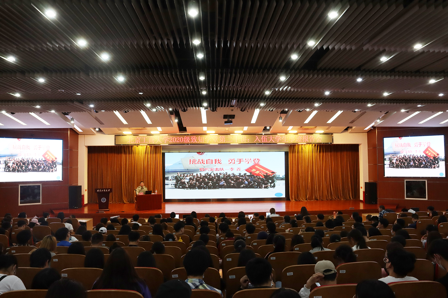 5月16日,致知學堂第八講邀請到北京某武警特戰大隊上尉李鑫,北京市朝陽區“戰疫排頭兵”馬辰兩位畢業生分享軍旅生涯。講座在良鄉主校區開講,以直播形式在阜成路校區東區禮堂開展。
