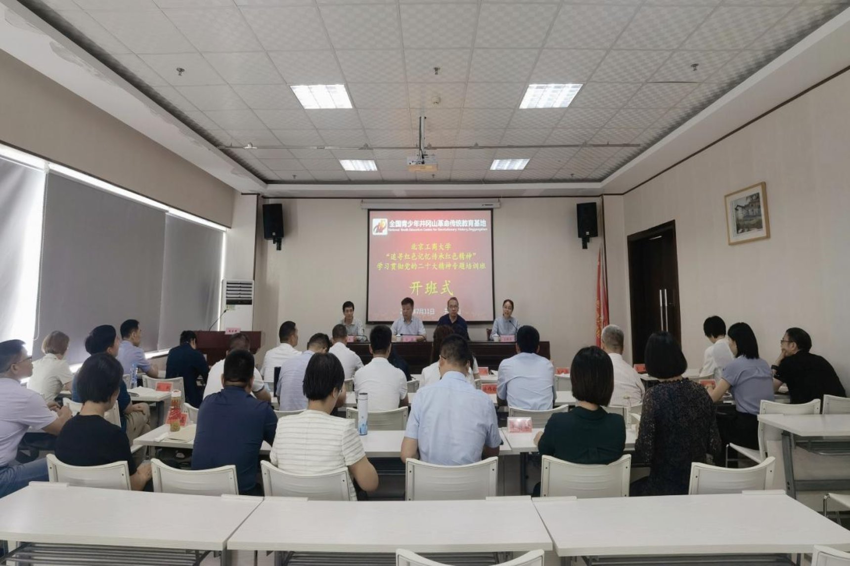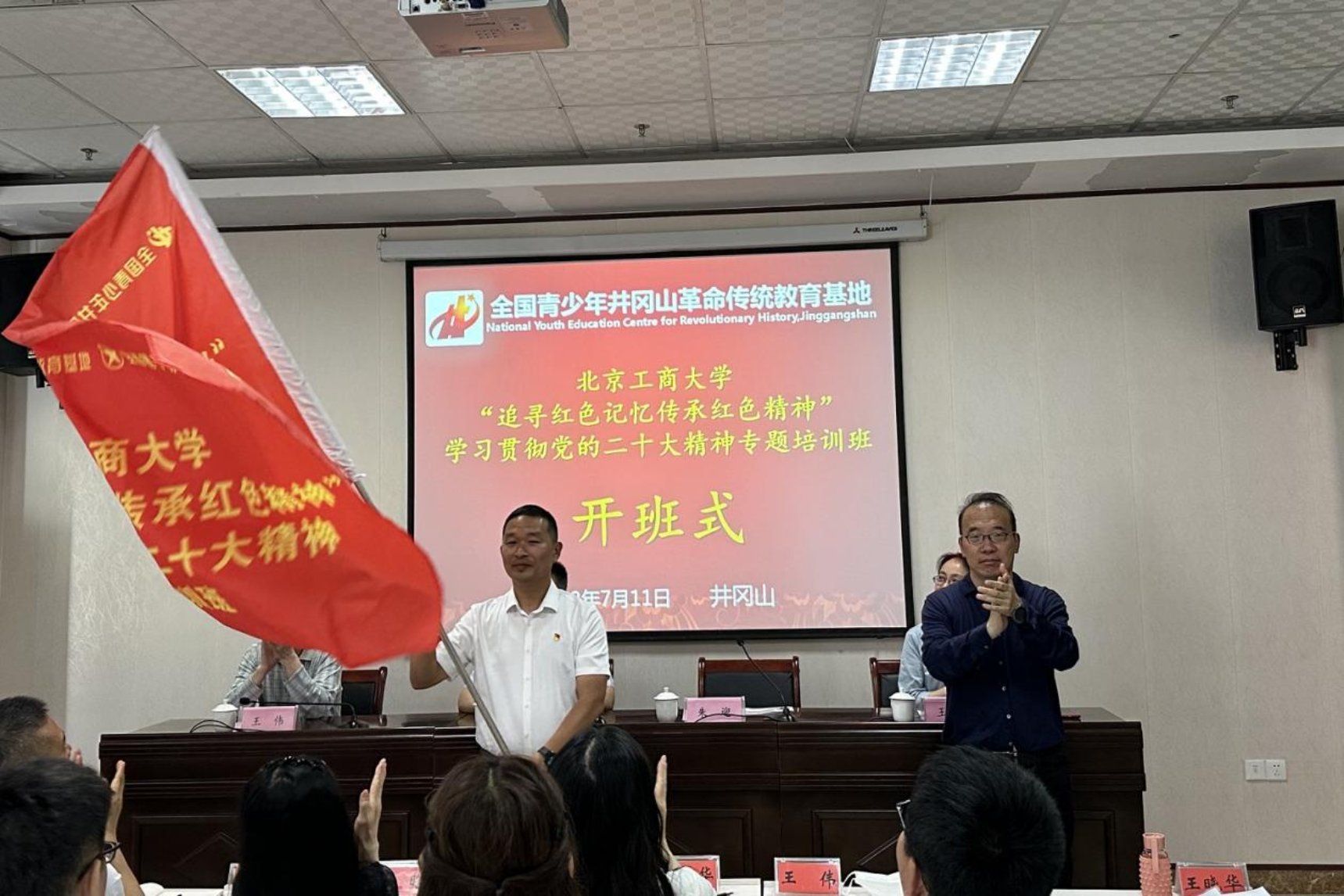 7月11日上午,培訓班開班儀式在團中央井岡山全國青少年革命傳統教育基地舉行?;毓芾碇行狞h委委員、副主任朱迎致辭并為培訓班授班旗。左敏作開班動員講話。