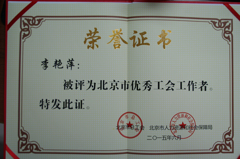 在集體獎項中,學校工會榮獲北京市教育工會2015年“綜合考評”獎、北京高校第九屆青年教師教學基本功比賽優秀組織獎、2014年北京市教育工會理論調研工作成果獲調研報告類一等獎、財務工作規范化建設先進單位、財務競賽先進單位、經審工作規范化建設考核優秀單位、北京市教育系統2015年“職工互助保障杯”教職工羽毛球比賽優秀組織獎,材料與機械工程學院工會、后勤部門工會榮獲2015年北京市教育工會先進教職工小家。