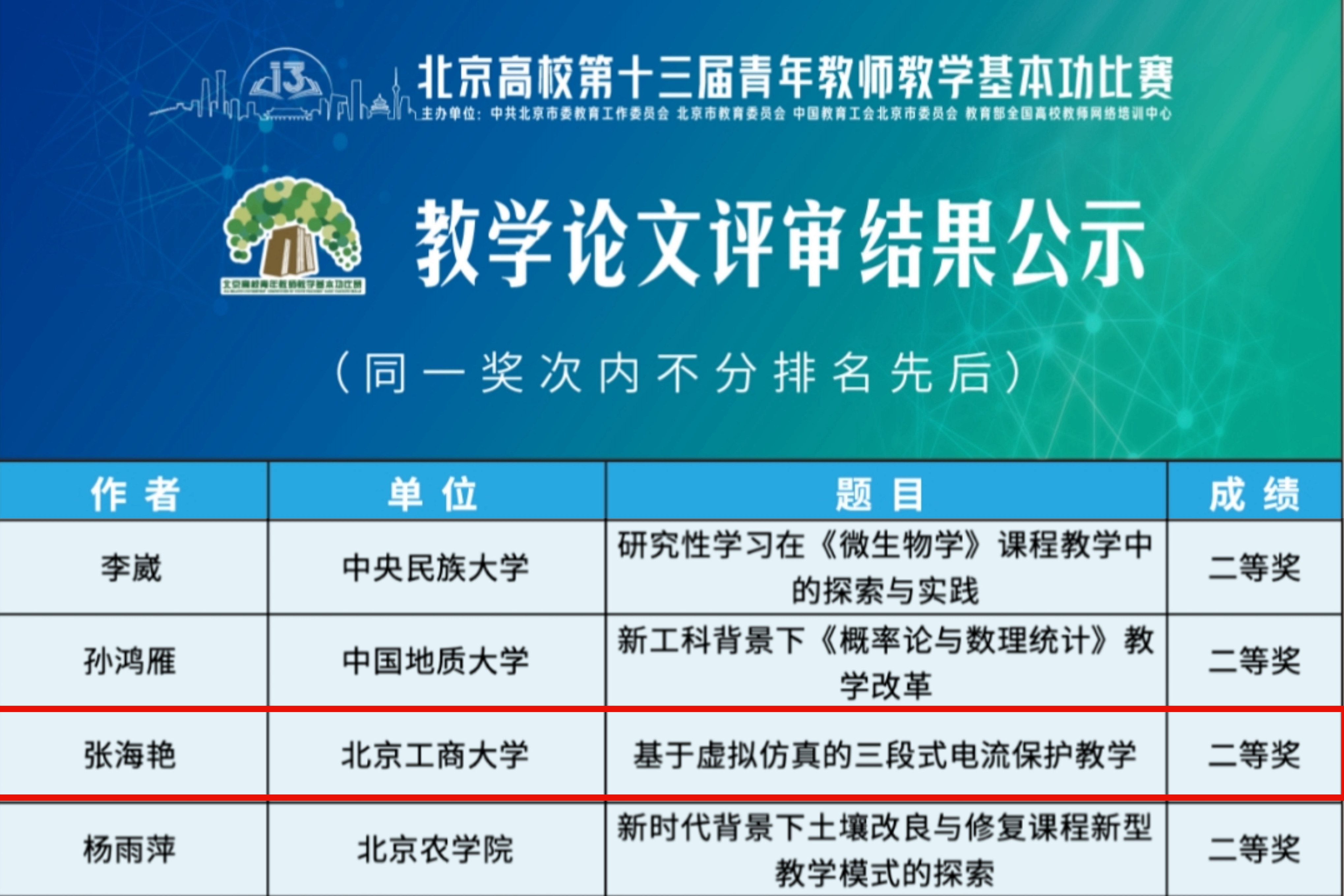 近日,北京高校第十三屆青年教師教學基本功比賽教學論文評比結果揭曉,我校計算機與人工智能學院張海艷的論文《基于虛擬仿真的三段式電流保護教學》榮獲二等獎,食品與健康學院張嬋的論文《BOPPPS教學模式下的<食品微生物學(食安)>教學改革與實踐》榮獲三等獎,這是我校教師首次在此項比賽中獲得二等獎,實現了在此賽事上的歷史性突破。