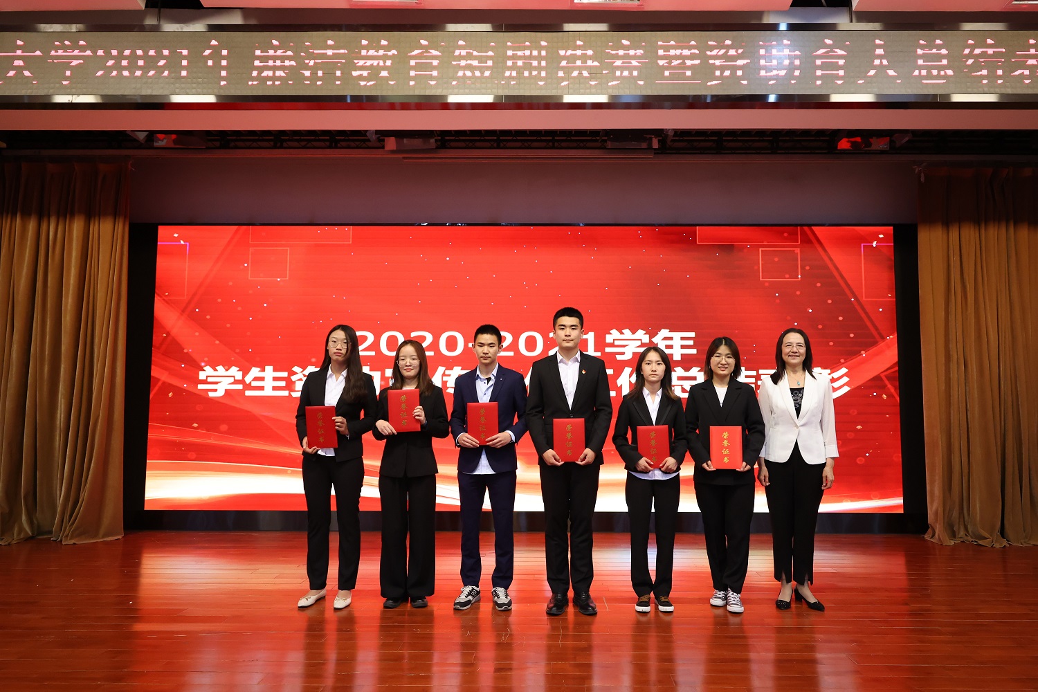 在總結(jié)表彰環(huán)節(jié),先后播放《“學(xué)生資助宣傳大使”工作紀(jì)實(shí)》和《資助育人 筑夢(mèng)青春》視頻分別回顧了我校學(xué)生資助宣傳大使團(tuán)隊(duì)在開展政策宣傳、事跡宣講、社會(huì)實(shí)踐、防疫抗疫等方面開展的主要工作以及學(xué)校在構(gòu)建資助育人體系、著力“兩個(gè)精準(zhǔn)”、搭建育人載體、培樹勵(lì)志典型所組織的一系列資助育人活動(dòng),充分展現(xiàn)了學(xué)校近年來(lái)在深化資助育人理念、拓展特色品牌活動(dòng),為家庭經(jīng)濟(jì)困難學(xué)生成長(zhǎng)成才保駕護(hù)航方面取得的突出成績(jī)。張梅為我校2020-2021年度“優(yōu)秀學(xué)生資助宣傳大使”輕工科學(xué)技術(shù)學(xué)院應(yīng)化192班趙雪瑩,化學(xué)與材料工程學(xué)院材料182班張周雅,人工智能學(xué)院信息182班鄧志常,商學(xué)院注會(huì)184班林一凡、工商19班蘇亞媛,計(jì)算機(jī)學(xué)院軟件181班李萌戰(zhàn)頒發(fā)了榮譽(yù)證書。李中奇副書記為學(xué)院資助育人工作優(yōu)秀組織獎(jiǎng)傳媒與設(shè)計(jì)學(xué)院、數(shù)學(xué)與統(tǒng)計(jì)學(xué)院、化學(xué)與材料工程學(xué)院、外國(guó)語(yǔ)學(xué)院頒發(fā)了榮譽(yù)獎(jiǎng)杯。