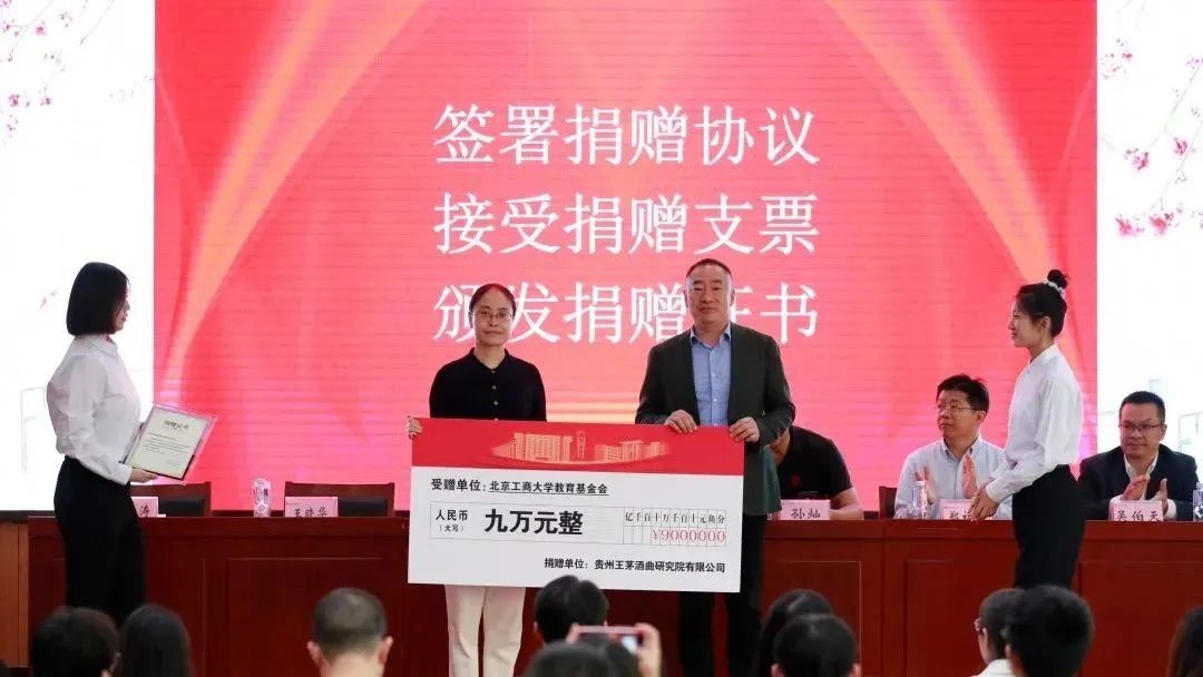 頒獎儀式上,郎瑩代表貴州王茅酒曲研究院與校方代表王曉華簽署了新一學年的捐贈協議,并向基金會贈與了捐贈支票。隨后,王曉華代表北京工商大學教育基金會向貴州王茅酒曲研究院頒發捐贈證書。