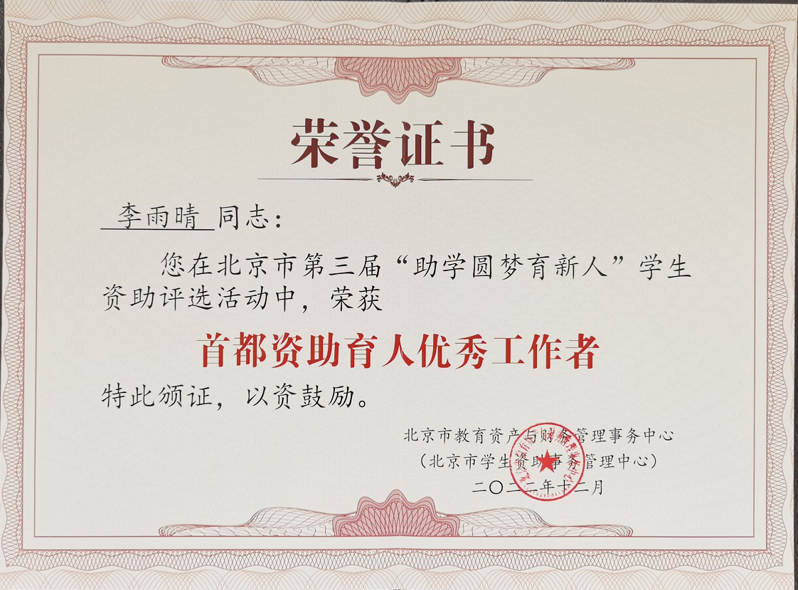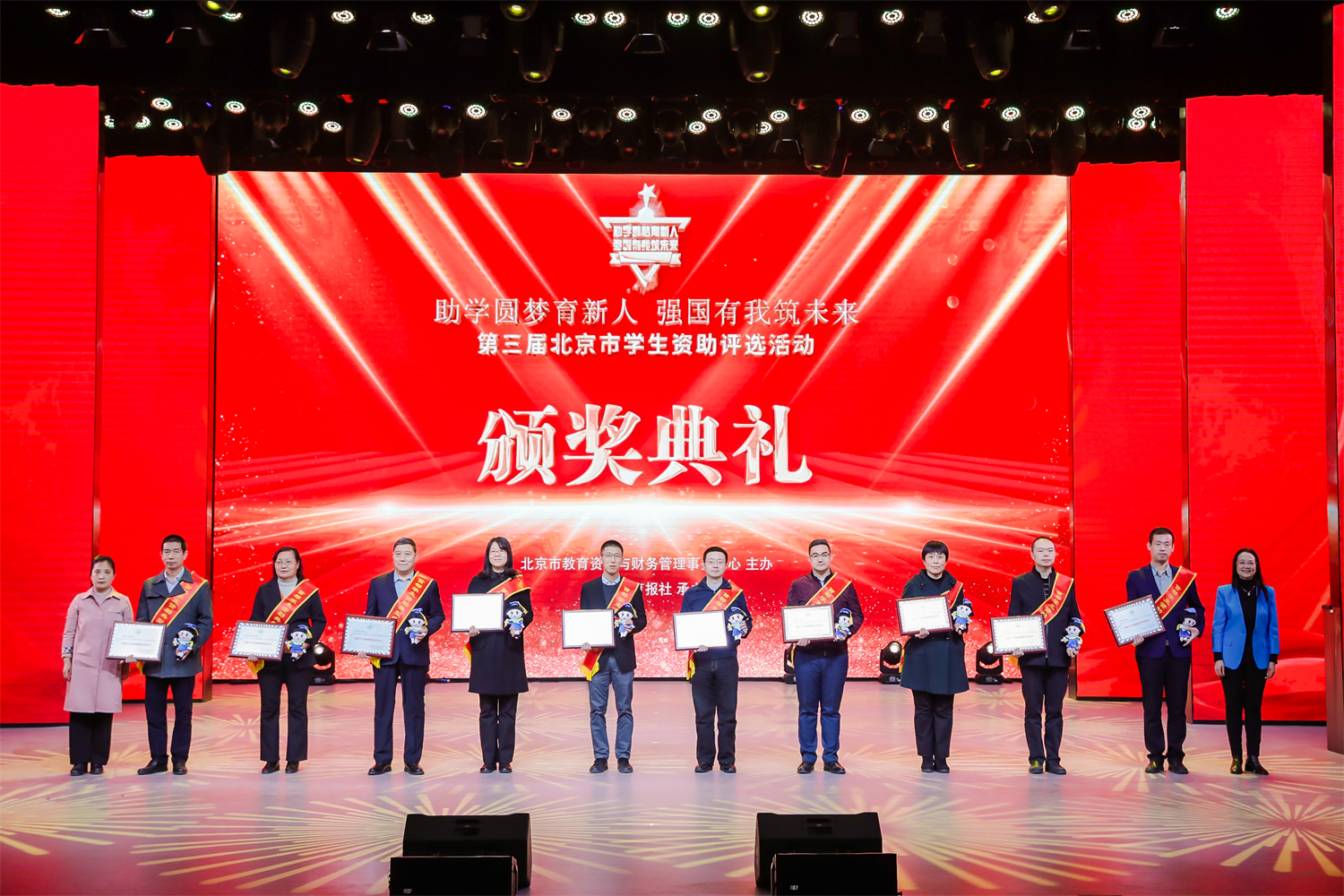 3月22日,北京市第三屆“助學圓夢育新人”學生資助評選宣傳活動頒獎典禮在京舉行。本次評選面向全市中小學、市屬高校及中等職業學校,我校獲評“首都學生資助典型經驗單位”,學生處李雨晴榮獲“首都資助育人優秀工作者”。全國學生資助管理中心副主任馬建斌,中共北京市委教育工委委員、北京市教育委員會副主任張永凱及各獲獎學校代表出席活動。