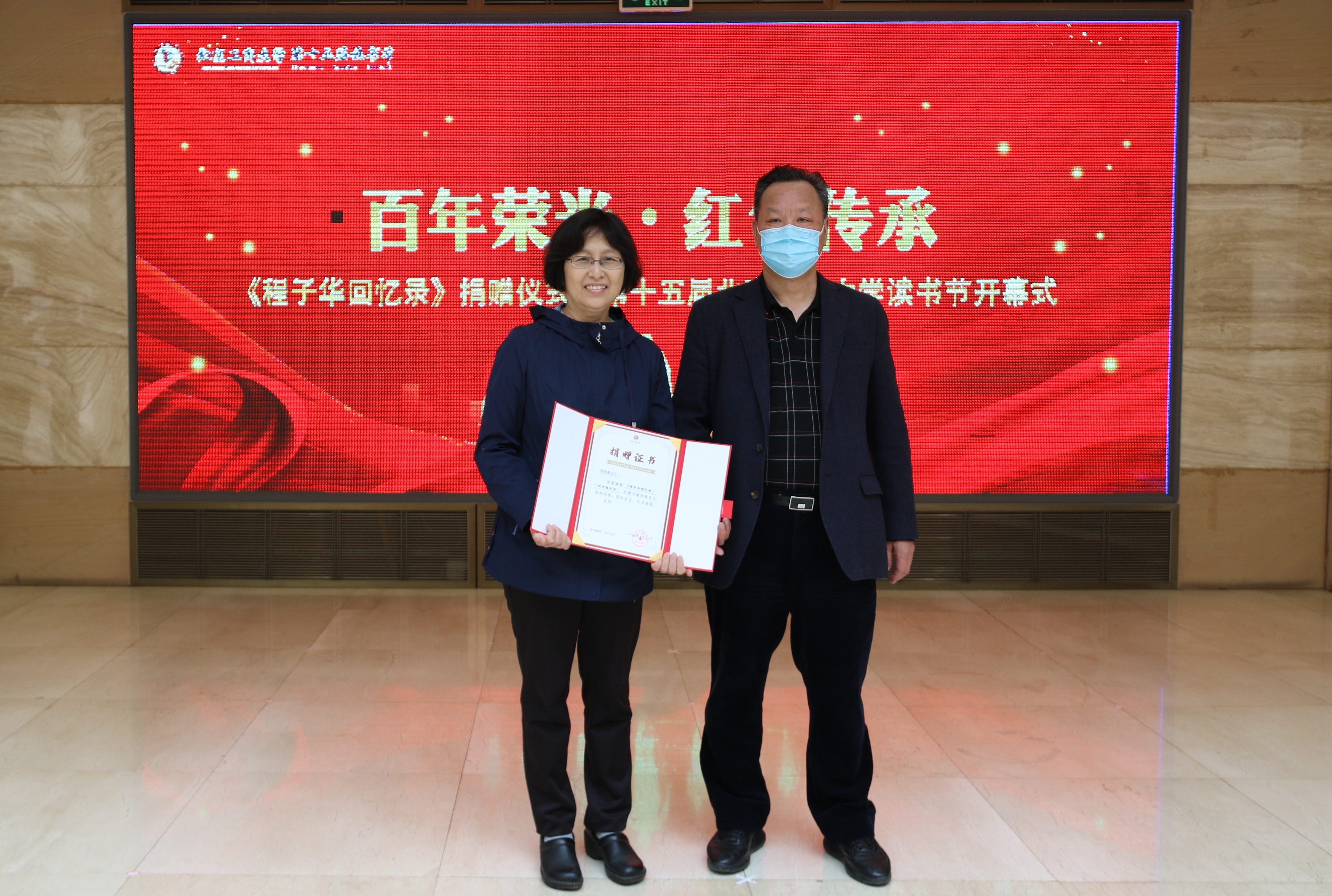 程海燕女士向圖書館捐贈了《程子華回憶錄》和《紀念程子華》。鄭文紅副校長為程海燕女士頒發了捐贈證書。