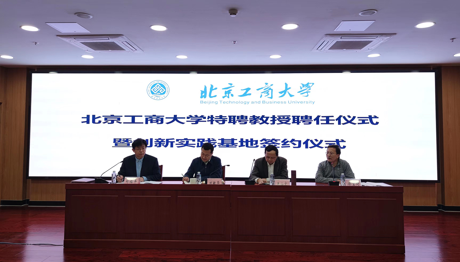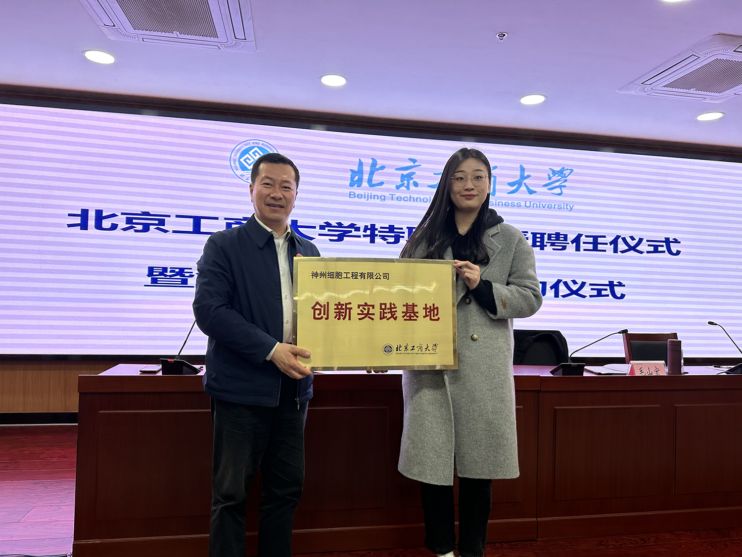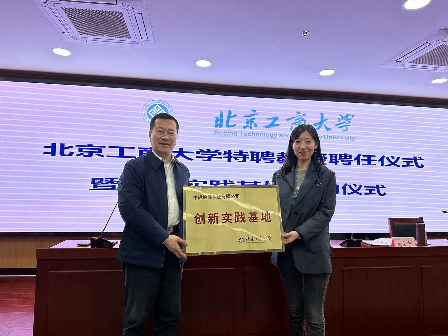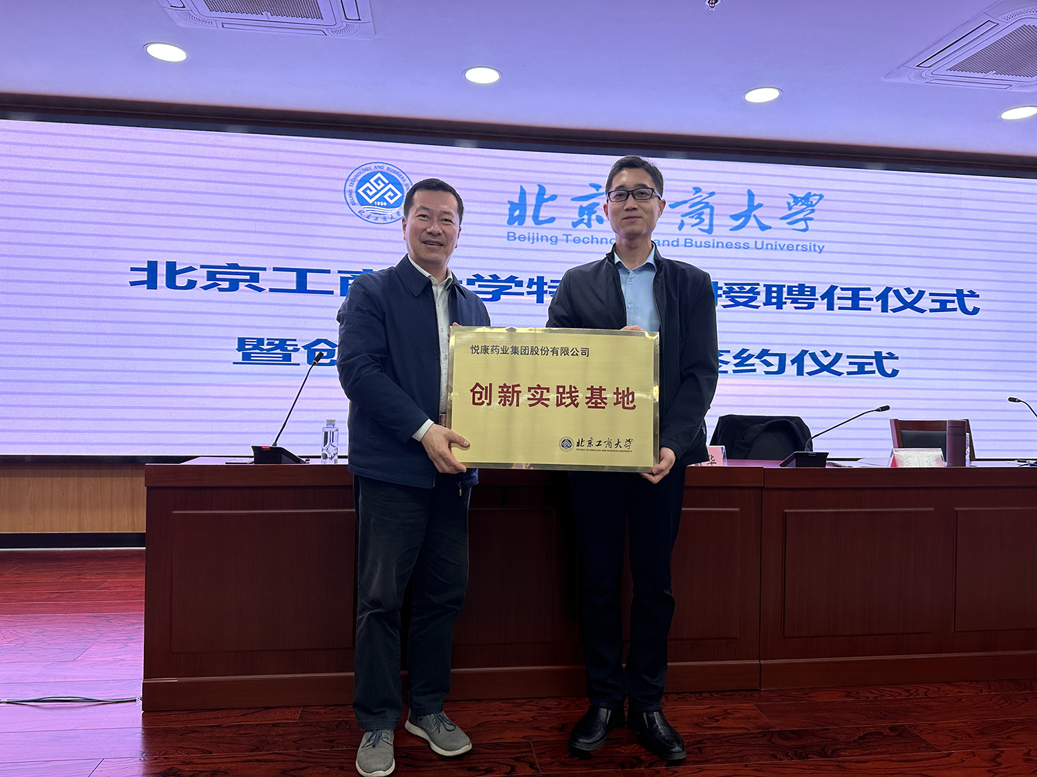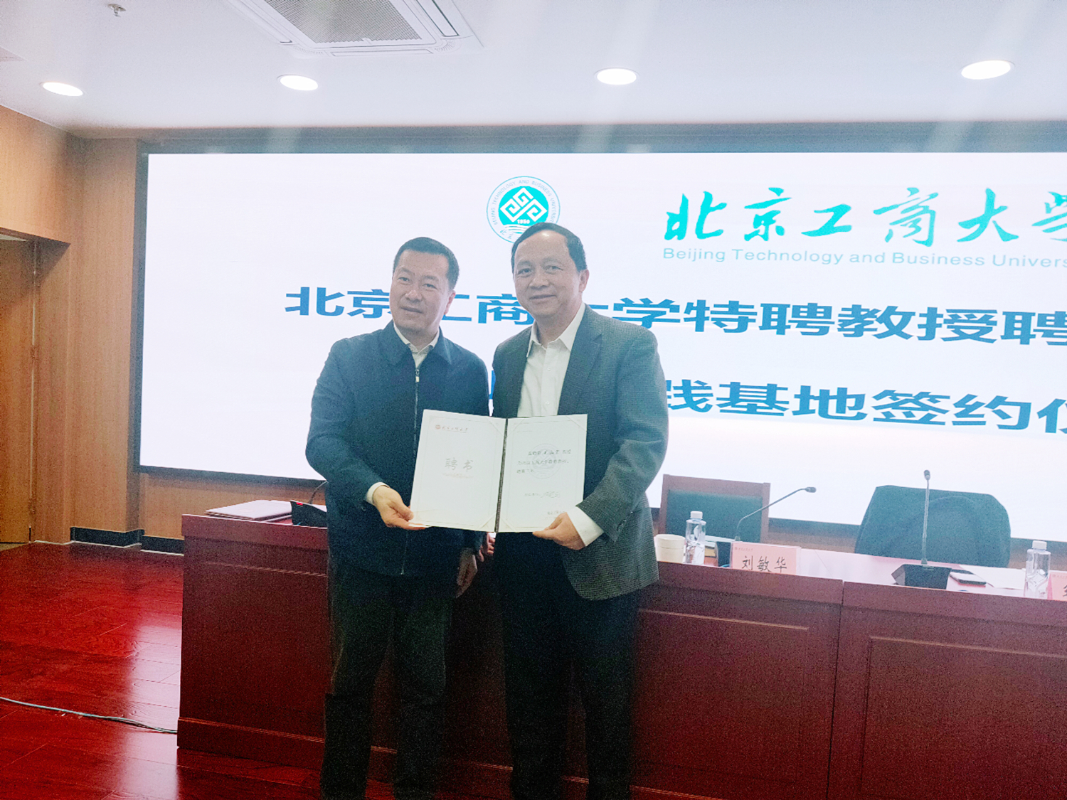 在聘任及掛牌儀式環節,劉敏華代表學校進行了聘書及實習基地牌匾的頒發授予。學校聘任毛山宏教授為特聘教授,聘任神州細胞董事長謝良志博士、悅康藥業藥物研究院院長宋更申經理為兼職教授,授予中輕檢測認證有限公司、神州細胞工程有限公司、悅康藥業股份有限公司北京工商大學創業實踐基地牌匾。