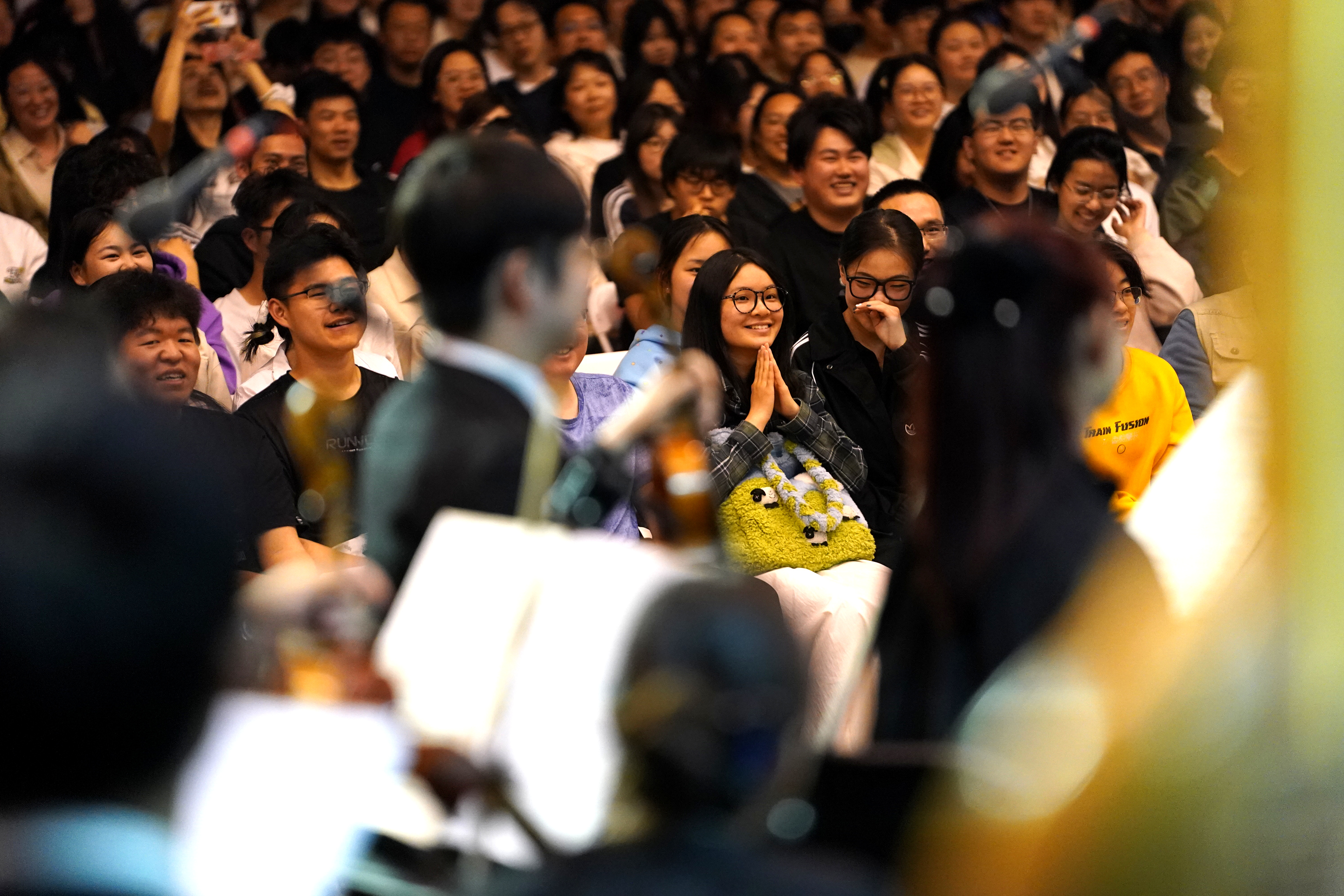 隨著最后一首曲目的結(jié)束,全場爆發(fā)出了雷鳴般的掌聲。在師生們的掌聲和呼喊聲中,樂團再次返場,獻上《燈火里的中國》《菊花臺》《激情燃燒的歲月》等曲目,現(xiàn)場的氣氛瞬間再次被點燃,將音樂會的氛圍推向了頂點。最終,在《康康舞曲》歡快的旋律中,音樂會圓滿落下帷幕。