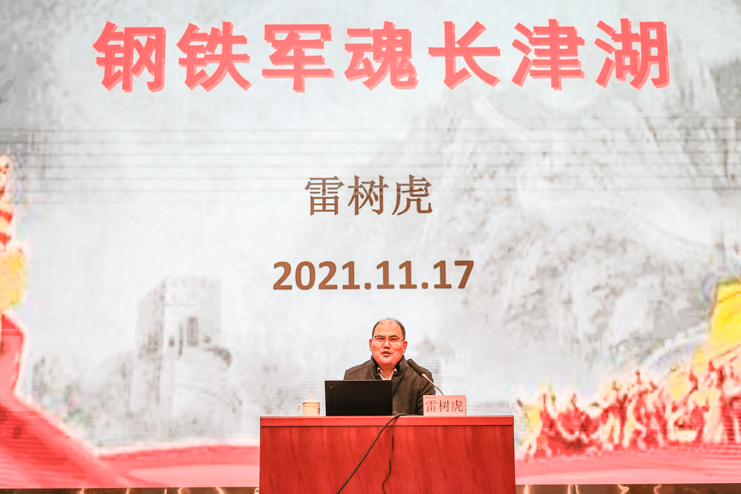 雷樹虎與大家分享他采訪志愿軍第九軍團司令宋時輪女兒的經(jīng)歷,當時,宋時輪的首要任務是“讓敵人從哪里來再從哪里退,之后穩(wěn)定戰(zhàn)局?!泵儡娕c我軍第九兵團的裝備實力懸殊,但我軍最終戰(zhàn)勝強敵。雷樹虎總結了其中的戰(zhàn)略密碼:“其一是第九軍團誘敵深入創(chuàng)造了圍殲強敵的有力戰(zhàn)機。其次是長途機動,隱蔽抵達,從而達到了‘攻其所不戒’的效果。最重要的是志愿軍在靈活運用戰(zhàn)術的基礎上,充分發(fā)揚英勇頑強、舍生忘死的革命英雄主義精神,‘以氣克剛’?!笔沟瞄L津湖戰(zhàn)役成為了保家衛(wèi)國的“立國之戰(zhàn)”。