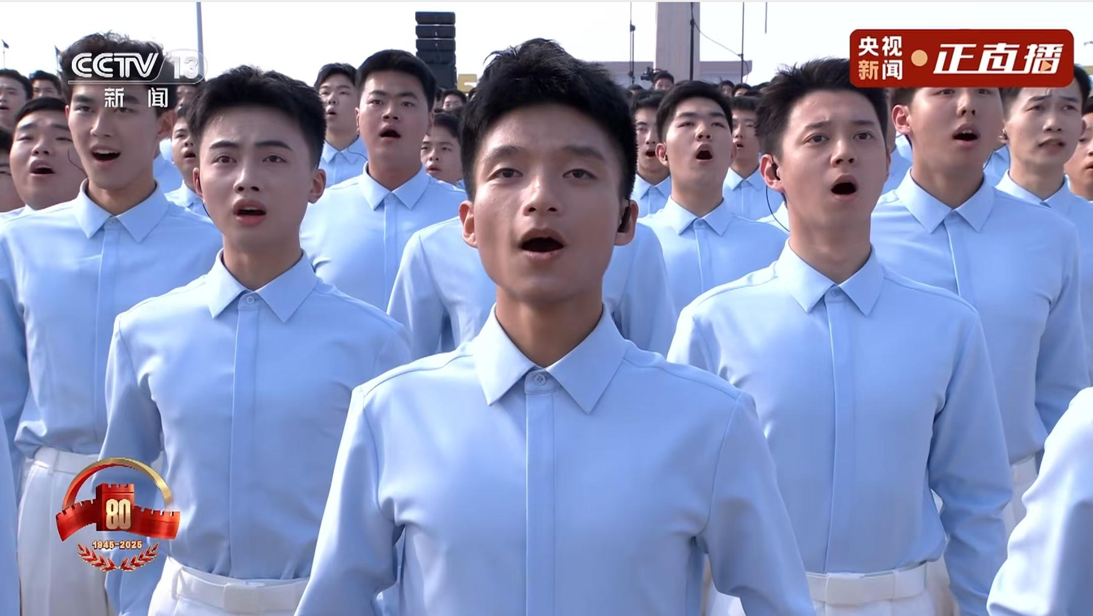 歌聲嘹亮,廣場合唱團(tuán)拉開序幕。由首都40所高校3000人組成的廣場合唱團(tuán)作為紀(jì)念活動(dòng)的重要組成部分,與聯(lián)合軍樂團(tuán)一起,奏唱《松花江上》《在太行山上》《保衛(wèi)黃河》等經(jīng)典抗戰(zhàn)歌曲,歌聲與銅管齊鳴,形成排山倒海的氣勢,他們?cè)诟杪曋谐隽酥腥A民族的“精神密碼”,誰膽敢侵犯我們,就會(huì)在這鋼鐵長城面前碰得頭破血流!現(xiàn)場仿佛能聽見平型關(guān)大捷的槍聲、百團(tuán)大戰(zhàn)的沖鋒號(hào),形成氣吞山河的“青春最強(qiáng)音” 。