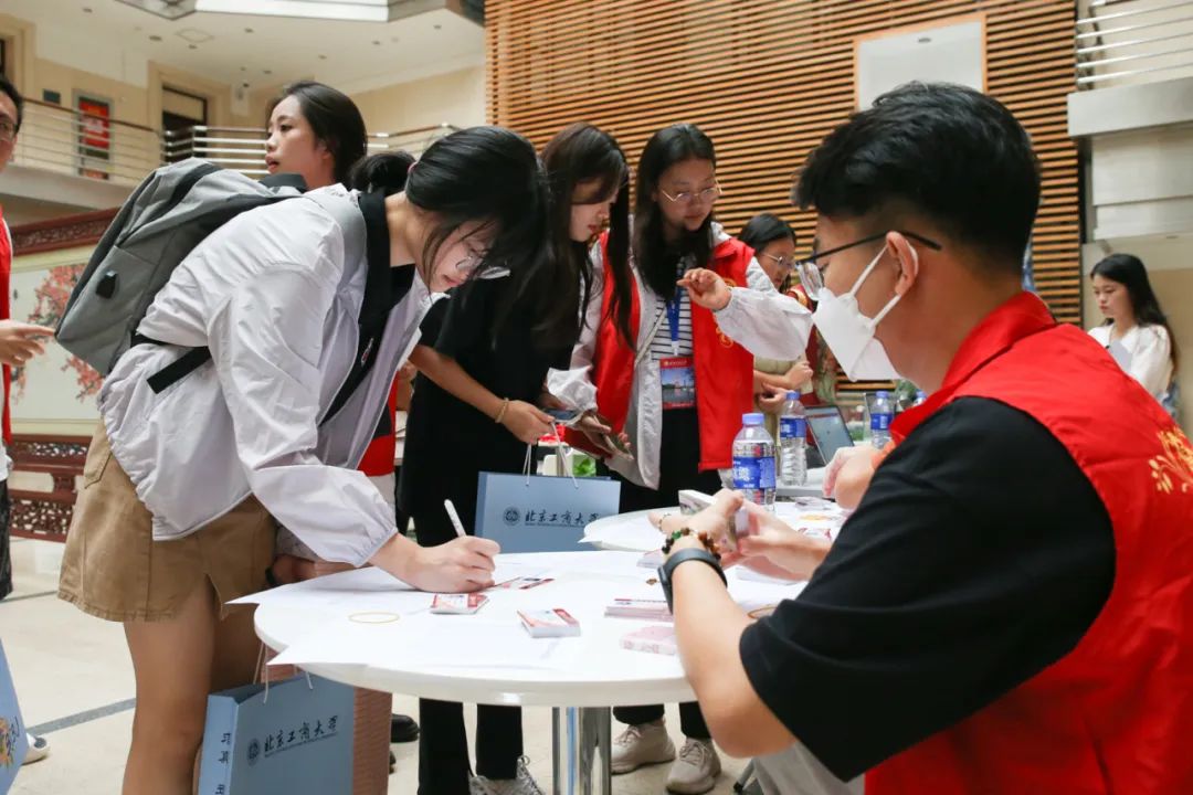 傳媒與設(shè)計(jì)學(xué)院將全體新生名字作為“金秋啟程 共赴未來”迎新主題填充紋理,并將學(xué)院全稱、專業(yè)名稱與新生生源高中名稱組合為“我愛北工商”英文字樣,結(jié)合學(xué)校特色元素排版制成宣傳橫幅。設(shè)計(jì)制作獨(dú)具特色的新生班級(jí)牌、設(shè)立特色路標(biāo),“我在北工商傳設(shè)很想你”“和你一起看藝A的櫻花”將學(xué)院建筑和名字融合,制作學(xué)院特色氈毛提包文創(chuàng)禮物贈(zèng)與新生,新生紛紛拍照打卡留念。
