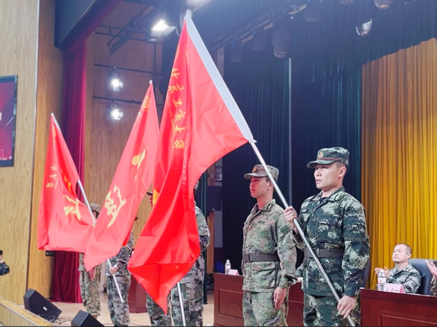 此次軍訓營營長、經(jīng)濟學院向小平和教導員學生處李昕霞共同為三個軍訓連授連旗。
