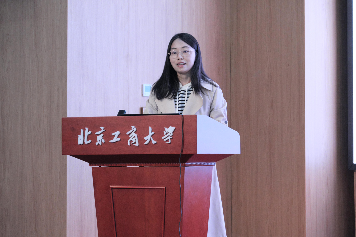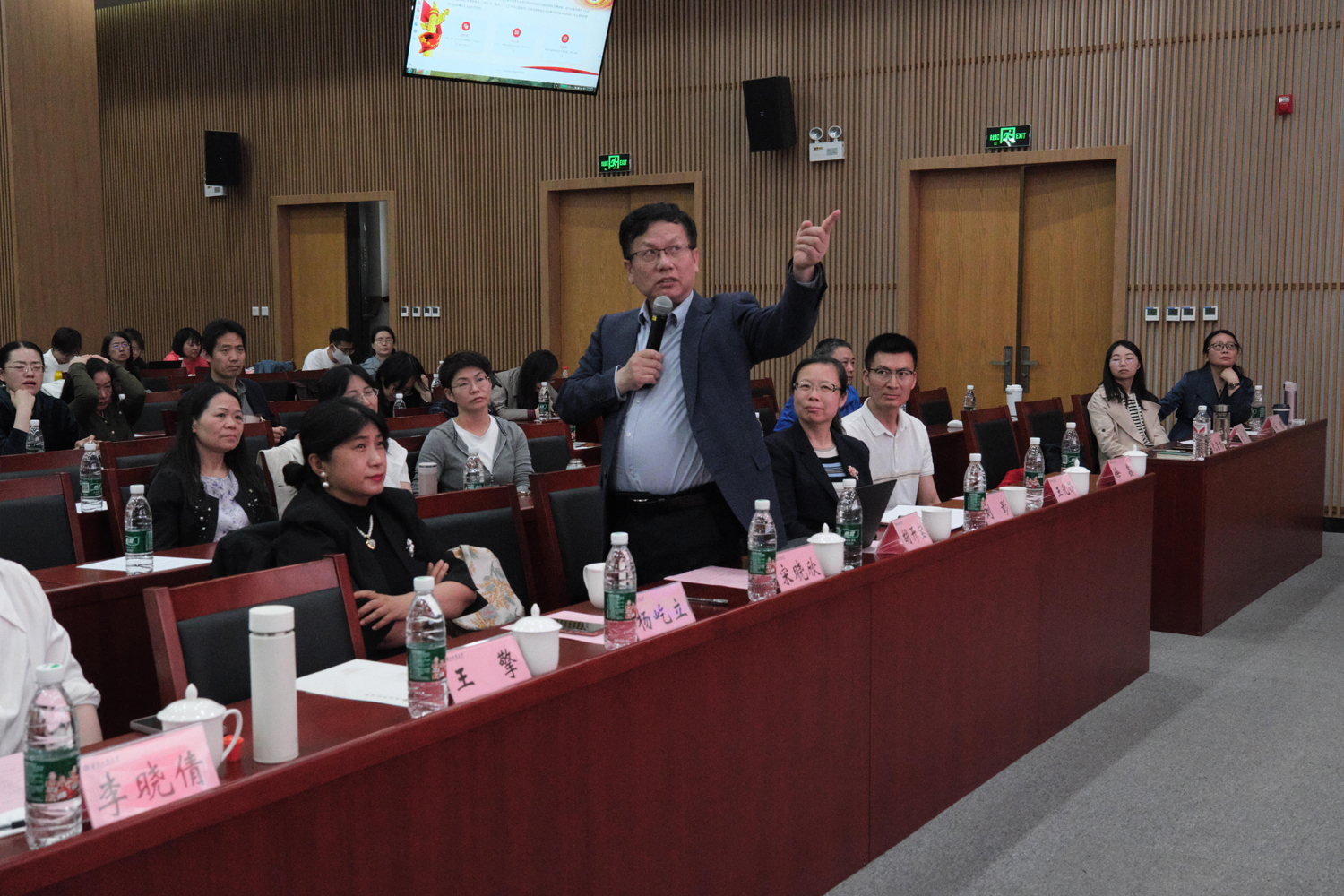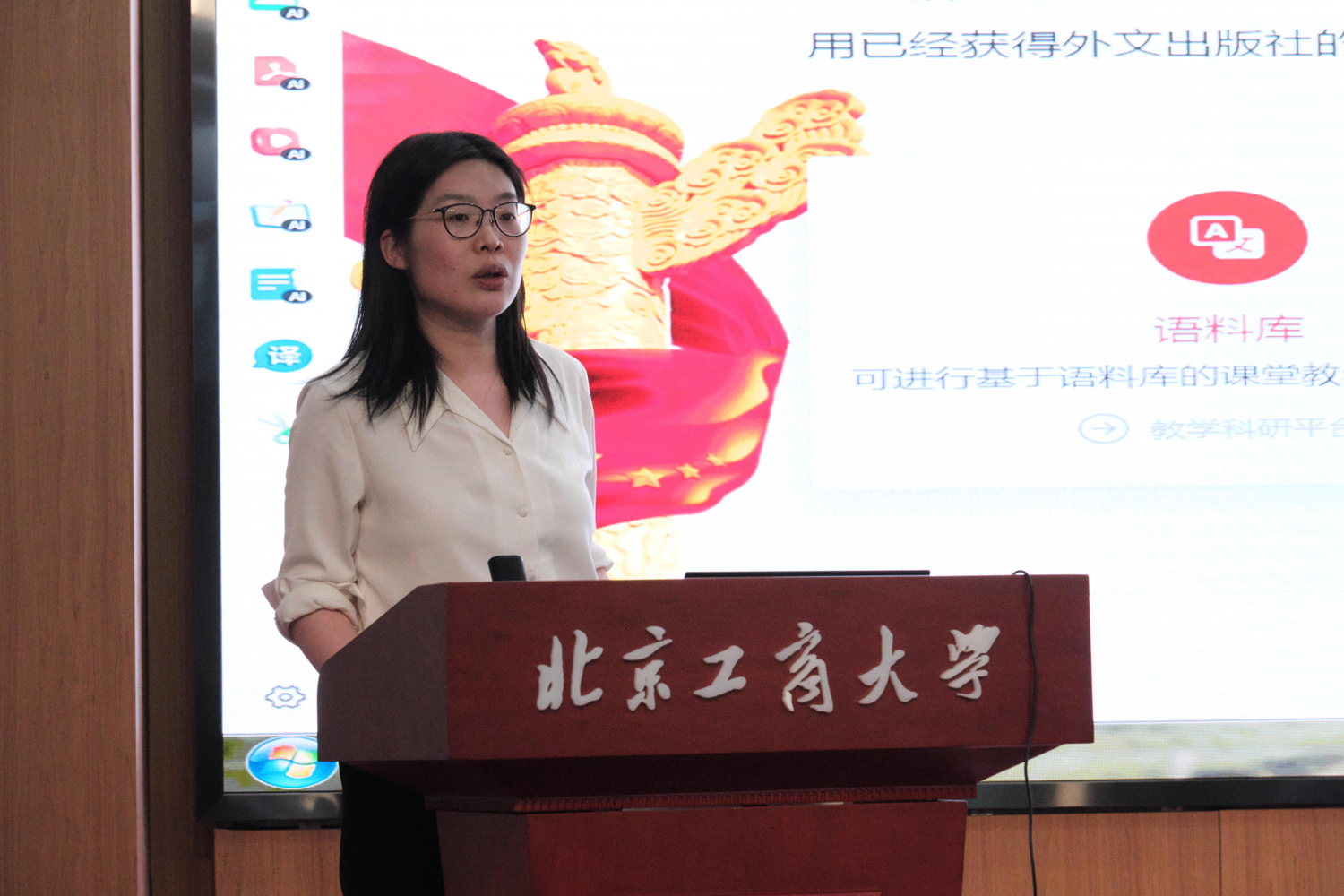 在主旨發言環節,語言與傳播學院關濤副教授以“《習近平談治國理政》多語種數據庫綜合平臺助力大學英語課程思政——以北京工商大學為例”為題進行匯報。吳濛副教授以“《習近平談治國理政》多語種數據庫綜合平臺在大學英語‘三進’工作中的實踐路徑探索”為題進行匯報。劉思含老師進行“語料庫賦能筆譯課程思政教學一以扶貧主題翻譯為例”的匯報。苗天順副教授進行“人工智能賦能外語課程思政構建”的匯報。胡開寶教授對4位教師的匯報分享作點評發言,他充分肯定了語言與傳播學院英語教學的探索實踐,并對語料庫助力教學科研的未來作出了規劃指導。