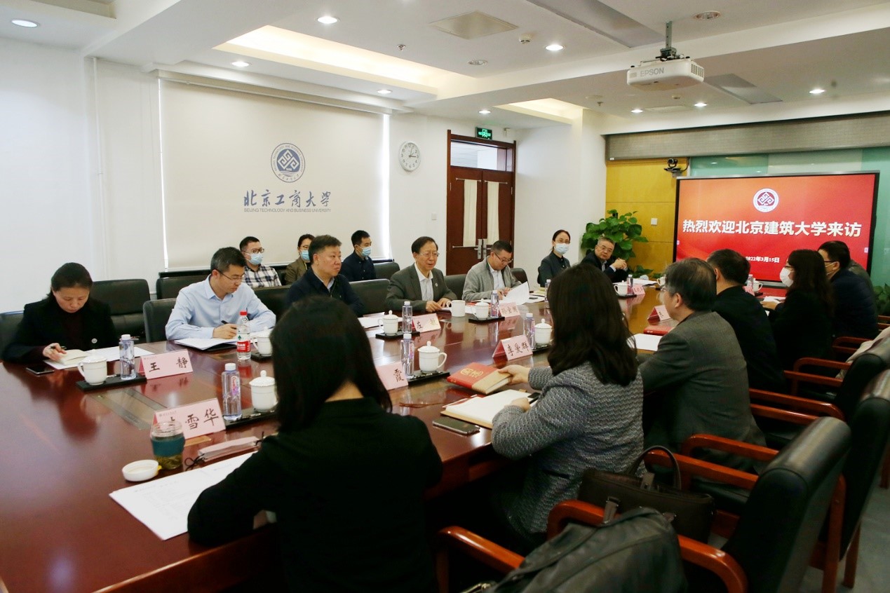 張大玉對我校的熱情接待表示感謝,并介紹了北京建筑大學在服務北京、加快發展方面面臨的機遇和挑戰。他談到,北京建筑大學作為北京地區唯一一所建筑類高等學校,特色鮮明、優勢突出,面對新形勢新任務,亟待進一步優化重組、改造升級,創造更多標志性成果,取得更大突破性進展。希望借鑒北京工商大學的經驗和做法,在學科建設、科研工作、高端平臺建設、高水平人才引育等方面加強了解,深化合作,共同提升。