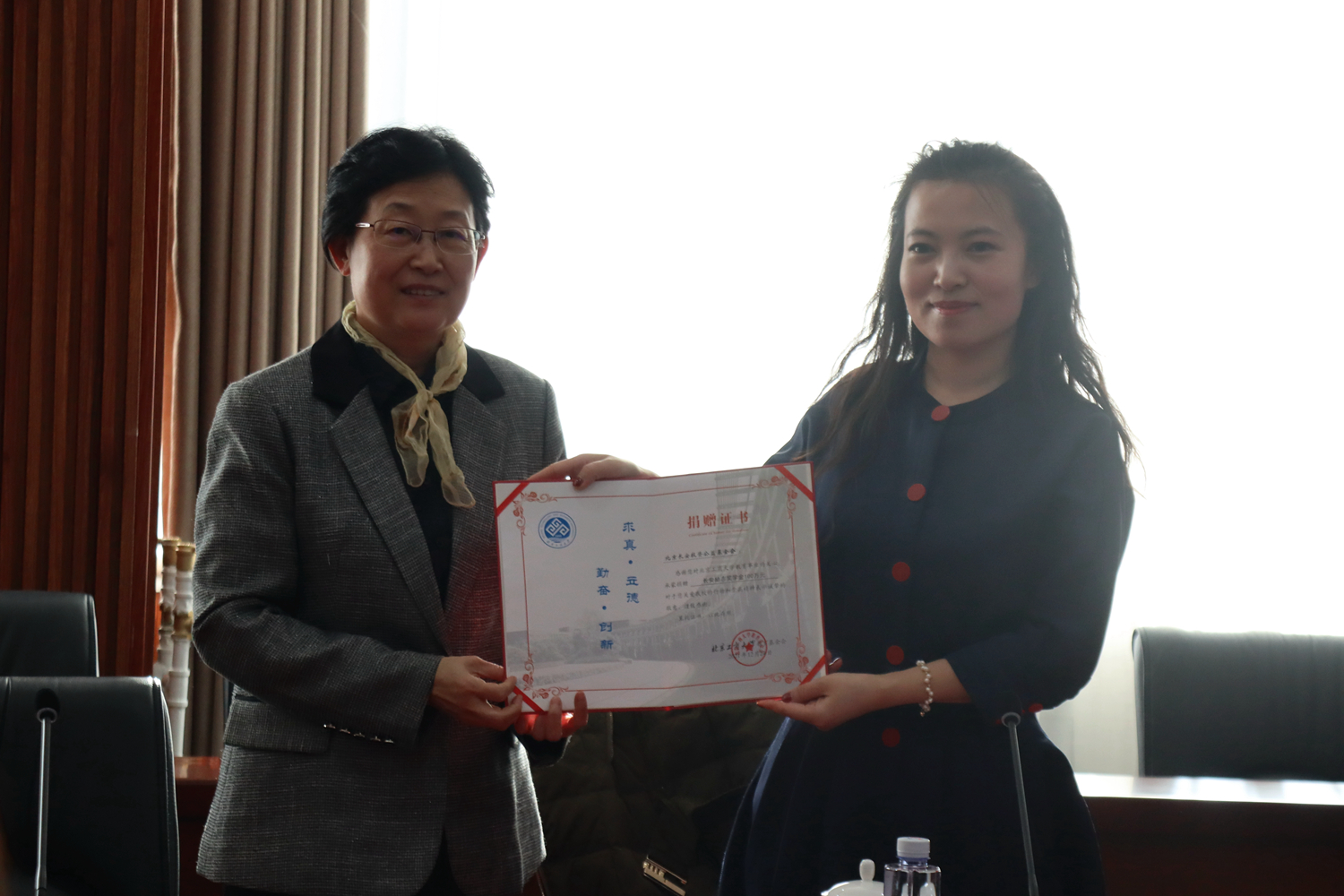 呂東燕代表學校教育基金會向北京長安投資公益基金會贈送捐贈證書。王曉華代表學校對北京長安投資集團有限公司、北京長安投資公益基金會長期以來對學校事業的關注和支持、對在校學生的關心和關愛表示感謝,對首屆獲獎學生表示祝賀!她談到,學校已進入建設高水平研究型大學的快速發展時期,一系列成績的取得離不開一代代北工商人的拼搏和奮斗,離不開一位位像侯守法一樣各界校友的熱心襄助和鼎力支持。希望同學們以優秀校友為榜樣,為學校、為社會、為國家多作貢獻,不辜負學校和老師的培養,不辜負捐贈方的善舉和期望。同時,她表示,學校教育基金會將嚴格按照相關制度要求,管好用好各項捐贈資金,充分發揮基金的激勵和正向引導作用,助推學校事業高質量發展。