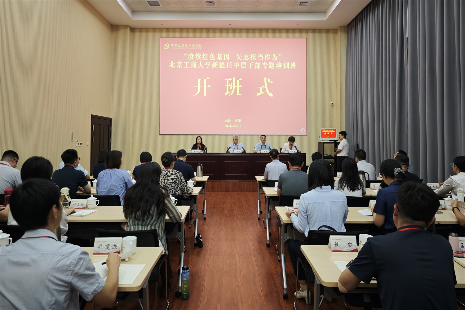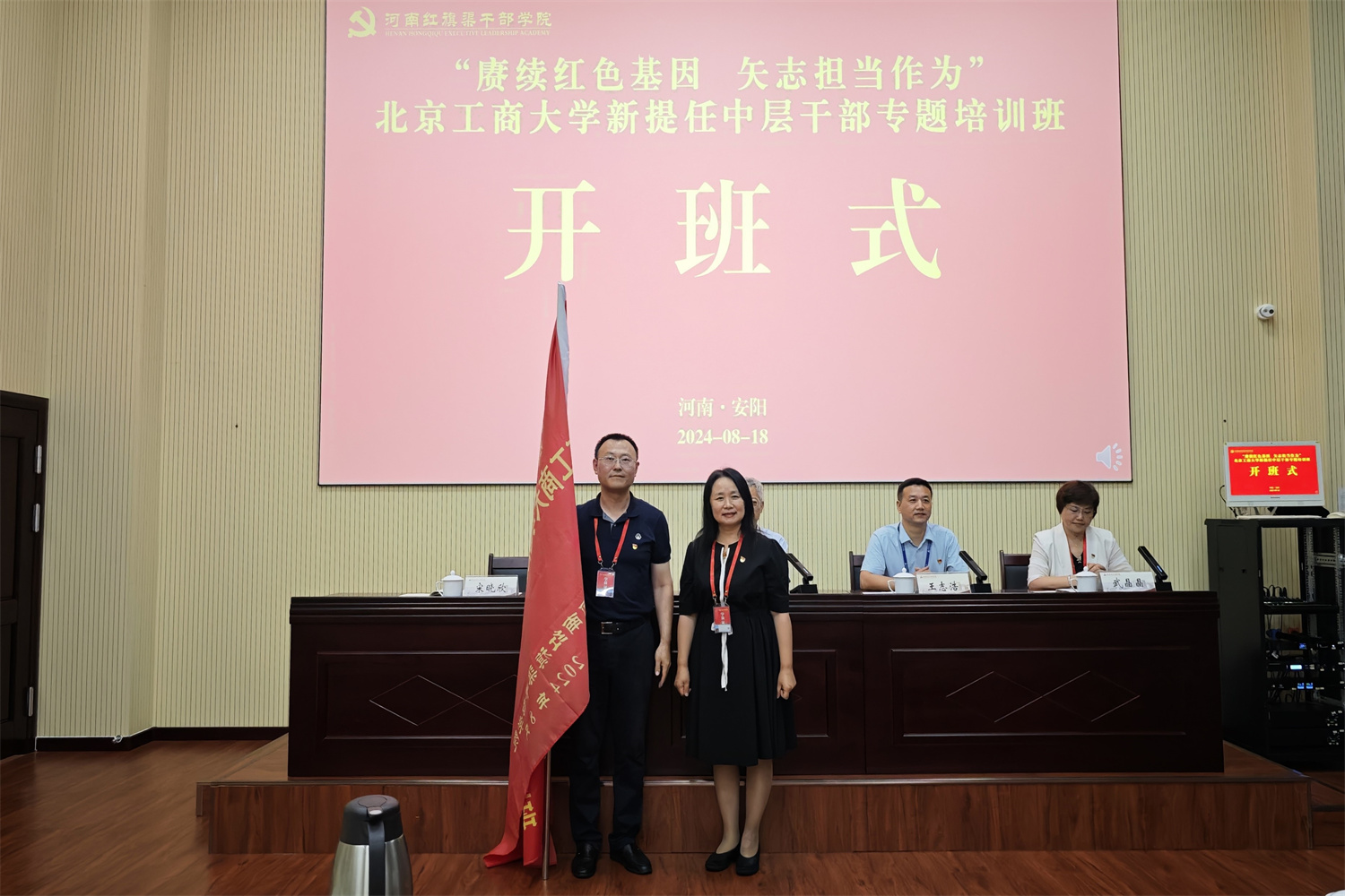 8月18日,新提任中層干部專題培訓在河南紅旗渠干部學院開班,我校黨委副書記李中奇、河南紅旗渠干部學院副院長王志浩出席并講話,我校黨委副書記宋曉欣為培訓班授旗,我校黨委常委、組織部部長兼統戰部部長武晶晶主持開班儀式。