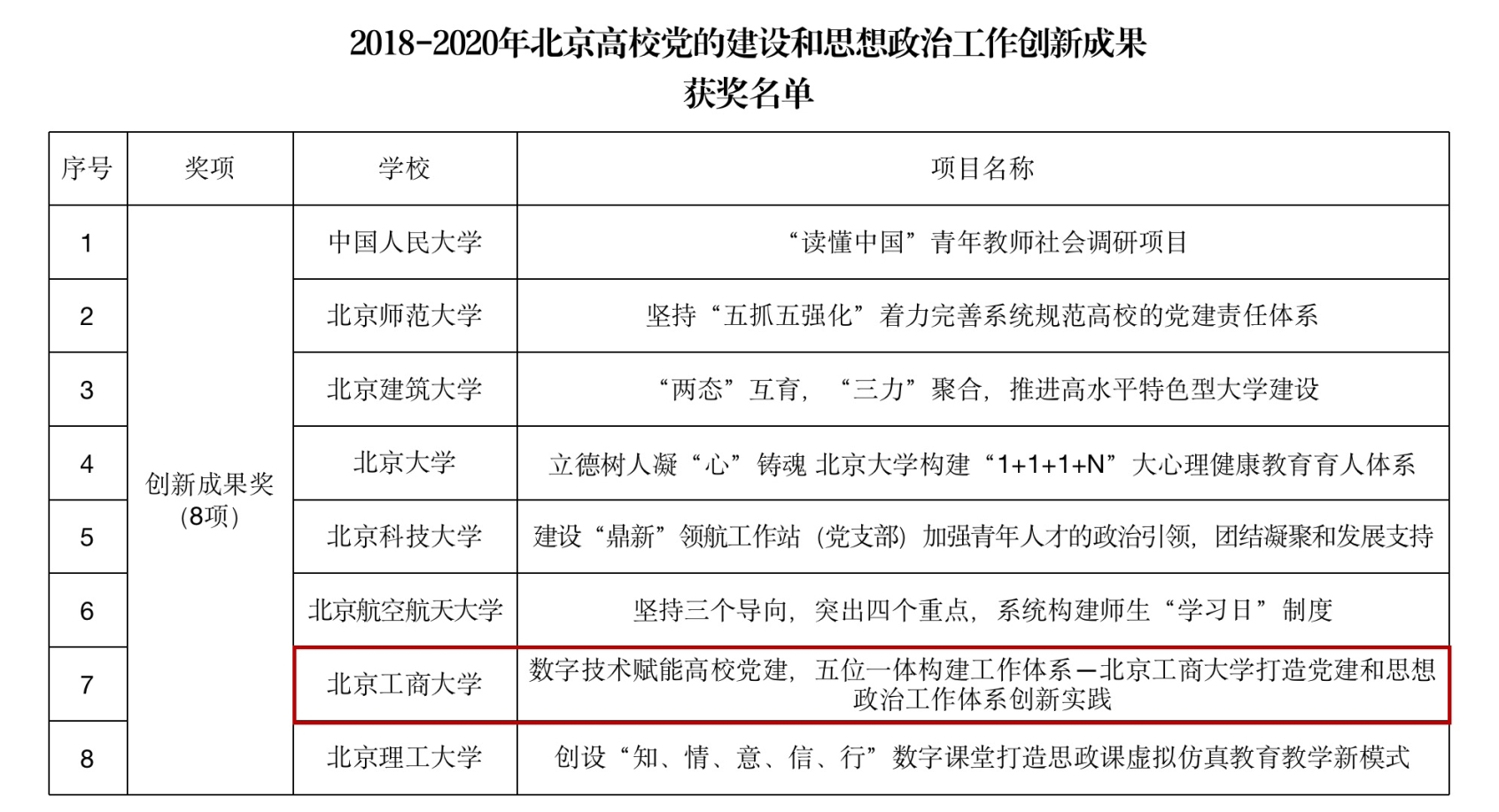 近日,北京市委教育工委公布了2018-2020年北京高校黨的建設和思想政治工作成果獲獎名單,我校《數字技術賦能高校黨建,五位一體構建工作體系》成果榮獲創新成果獎。