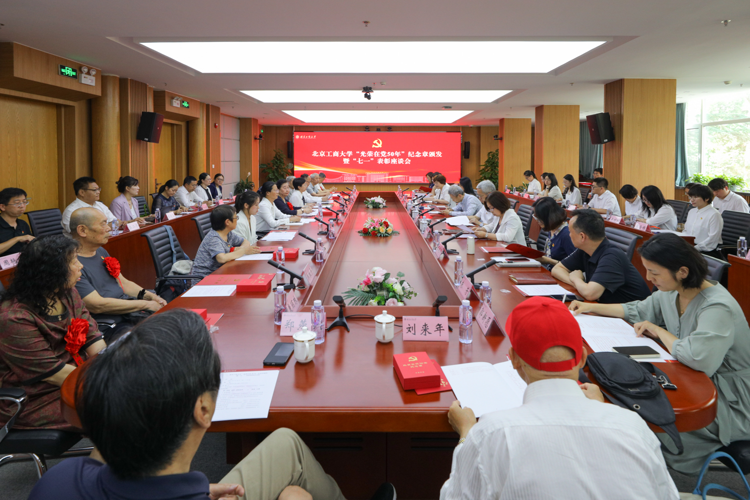 在中國共產黨成立104周年之際,為表彰先進典型,弘揚奮斗精神,6月30日,學校召開“光榮在黨50年”紀念章頒發暨“七一”表彰座談會。黨委書記沈千帆,黨委副書記李中奇、宋曉欣,黨委常委、紀委書記、二級高級監察官楊紅出席會議。學校黨委職能部門負責人,各二級黨組織書記以及學校“兩優一先”獲獎代表,“光榮在黨50年”紀念章獲得者代表和新黨員代表參加會議。座談會由黨委常委、黨委組織部部長、黨委統戰部部長武晶晶主持。