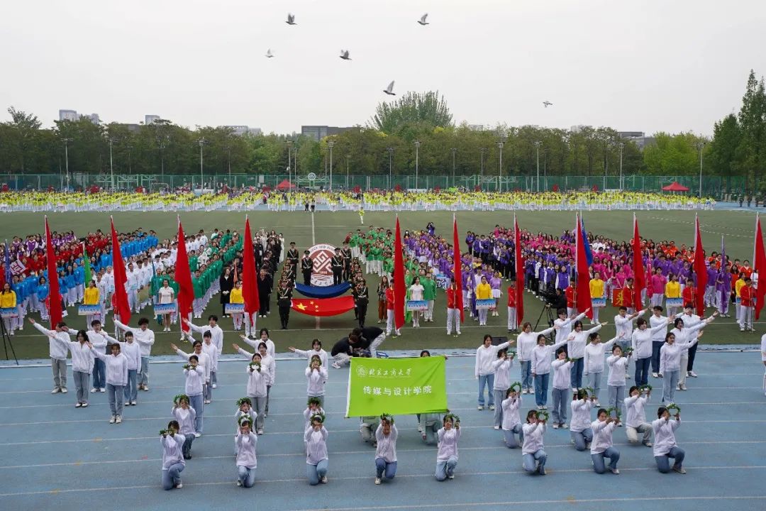 15個學院代表隊方陣精神飽滿地走進運動場,他們衣著統一、隊形整齊、口號嘹亮。學院方陣入場表演結合學院特色、創意十足,展現出北工商人昂揚向上的青春風采。五星紅旗在音樂中緩緩升起,全場師生共同唱響國歌,氣氛熱烈而莊重。