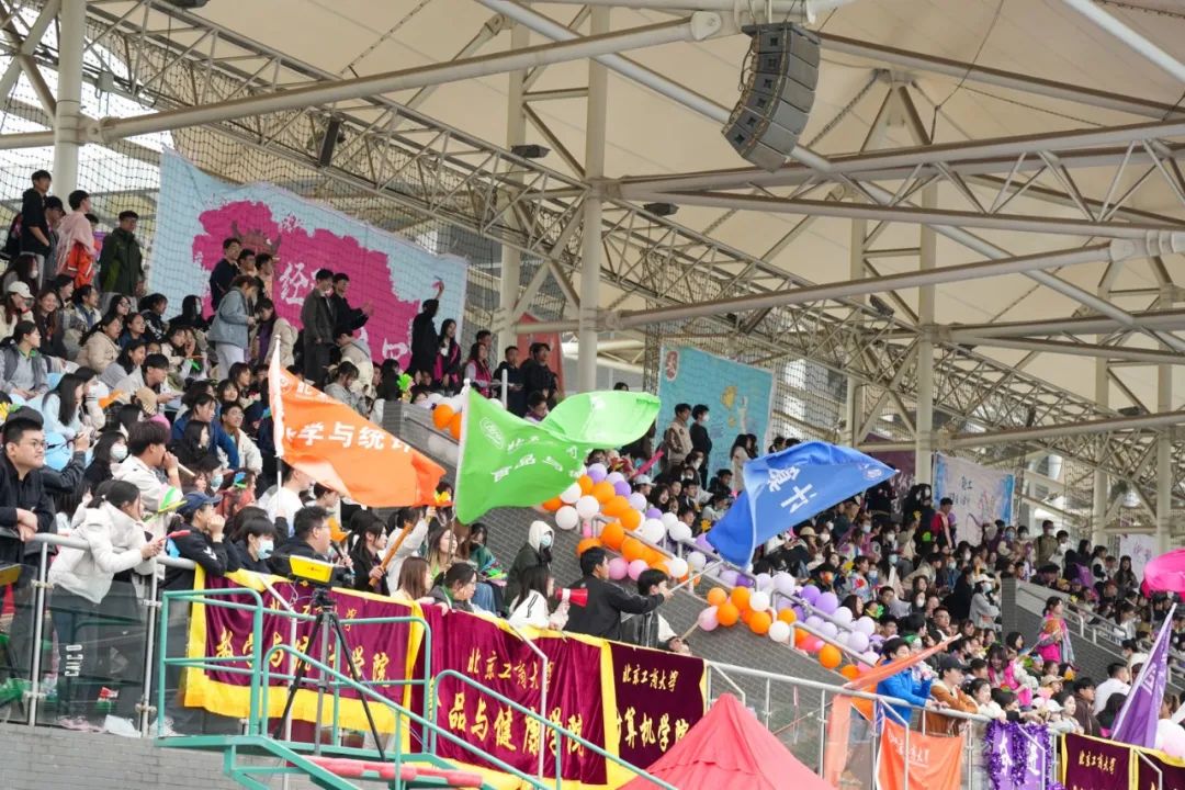 觀眾席上五彩斑斕,各學院院旗隨風舞動,鼓聲、口號聲、吶喊聲此起彼伏。啦啦隊員們懷揣著集體榮譽感為運動員們加油助陣,運動場上洋溢著激情、文明、和諧的氛圍。