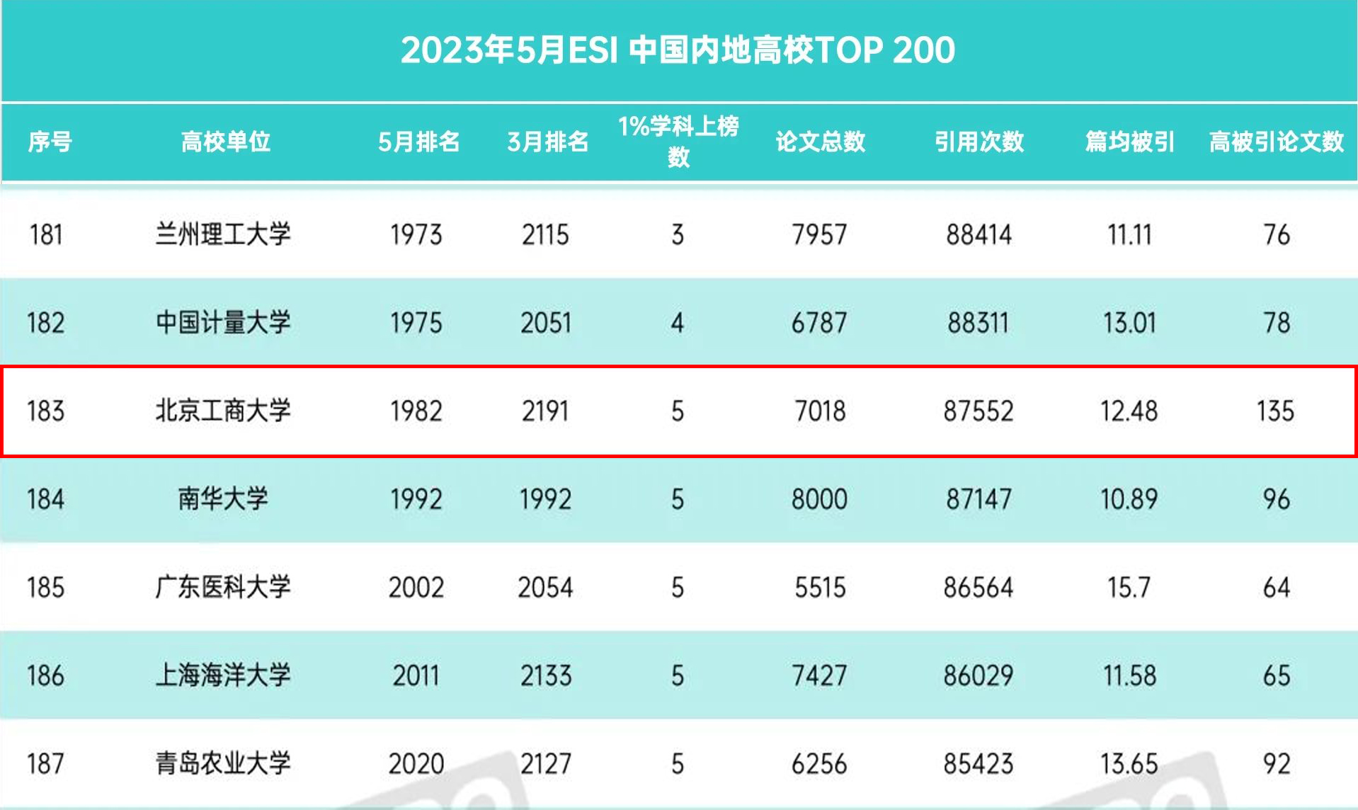 據青塔數據分析,北京工商大學ESI綜合排名位居全球1982位,較去年同期提升541位(去年2523位)。本次中國內地高校ESI排名TOP200,多所高校取得明顯的進步。其中北京工商大學進步最大,國際排名上升209個位次,位居國內183位。