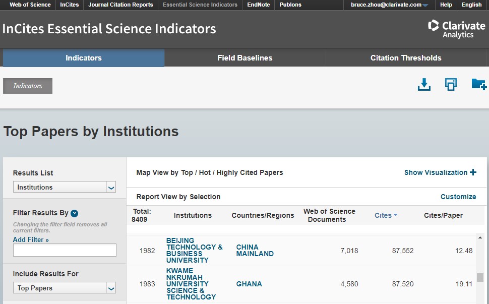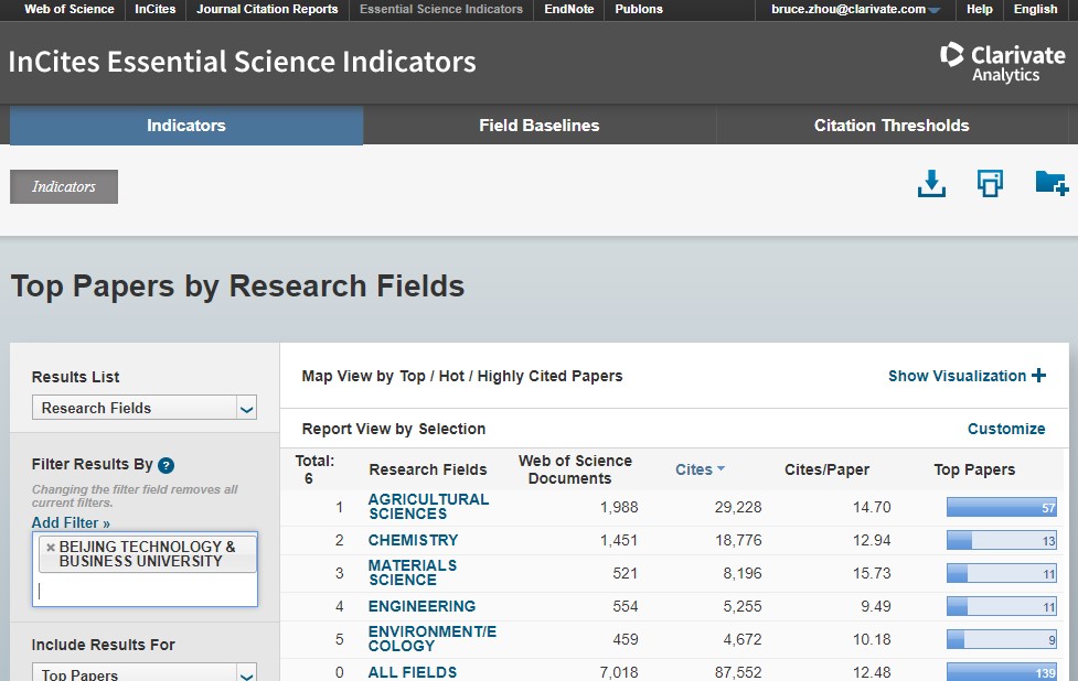 基本科學指標數據庫(Essential Science Indicators,簡稱ESI)是由世界著名的學術信息出版機構美國科技信息所(ISI)于2001年推出的衡量科學研究績效、跟蹤科學發展趨勢的基本分析評價工具。ESI針對22個學科領域,對全球所有高校及科研機構被收錄進SCI、SSCI庫中約10年時間跨度的article、review論文數據進行統計,通過論文數、論文被引頻次、論文篇均被引頻次、高被引論文、熱點論文和研究前沿論文等6大指標,從多角度對國家/地區科研水平、機構學術聲譽、科學家學術影響力以及期刊學術水平進行全面衡量,兩個月滾動更新一次。ESI已成為當今世界范圍內普遍用以評價高校、學術機構、國家/地區國際學術水平及影響力的重要評價指標工具之一。