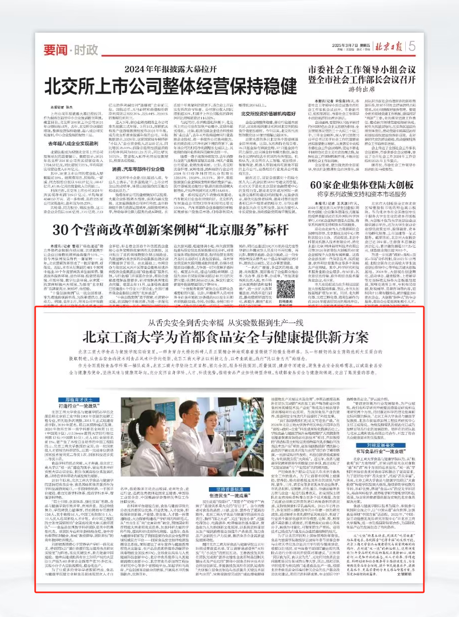 3月7日,《北京日報》第五版要聞·時政版以《從舌尖安全到舌尖幸福 從實驗數(shù)據(jù)到生產(chǎn)一線,北京工商大學為首都食品安全與健康提供新方案》為題,報道了我校食品與健康學院聚焦食品安全戰(zhàn)略需求,以賦能食品安全與健康為使命,堅持風味與健康雙導向,為首都食品安全與健康提供新方案。