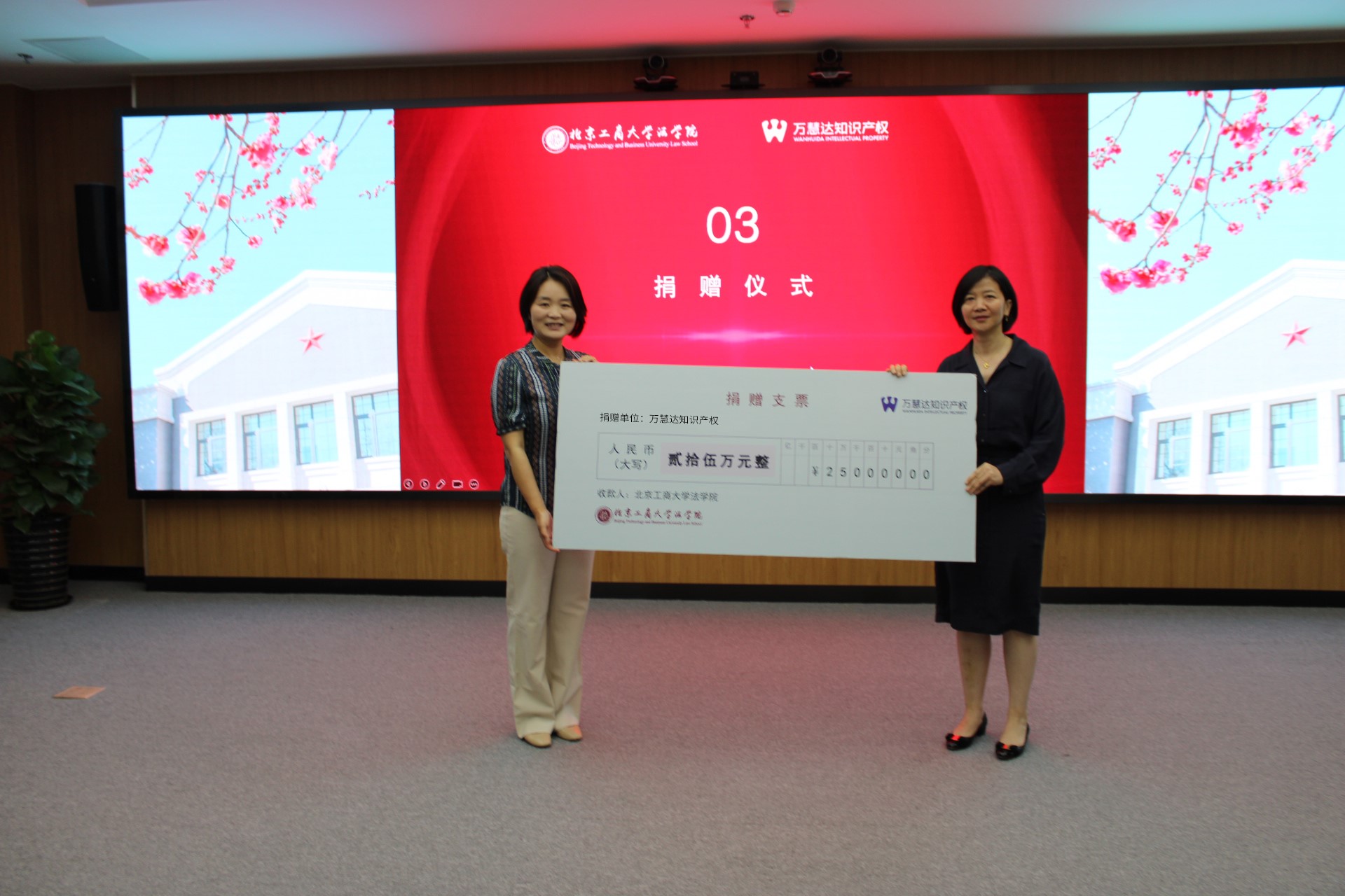 在捐贈(zèng)儀式環(huán)節(jié),萬(wàn)慧達(dá)向北京工商大學(xué)法學(xué)院捐贈(zèng)人民幣25萬(wàn)元,用于發(fā)展學(xué)院法學(xué)學(xué)科和培養(yǎng)知識(shí)產(chǎn)權(quán)領(lǐng)域法學(xué)創(chuàng)新人才。