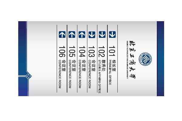 學校走廊導向牌是北京工商大學學校視覺識別系統內部環境的重要組成部分,在實際應用中應嚴格按照本頁圖例規范使用。