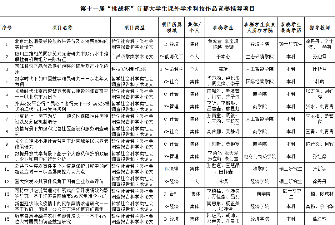 校級評審由15位校外專家擔(dān)任評委,他們本著“公平、公正、公開”的原則,根據(jù)作品創(chuàng)新性、學(xué)術(shù)性、規(guī)范性、應(yīng)用性等方面進(jìn)行綜合評定。最終,按要求推薦15個項目上報首都“挑戰(zhàn)杯”競賽組委會,具體項目詳見附件。參加首都賽的各項作品將繼續(xù)完善,努力在第十一屆“挑戰(zhàn)杯”首都大學(xué)生課外學(xué)術(shù)科技作品競賽中展現(xiàn)出我校學(xué)生的學(xué)術(shù)水平?,F(xiàn)對所推薦項目予以公示。