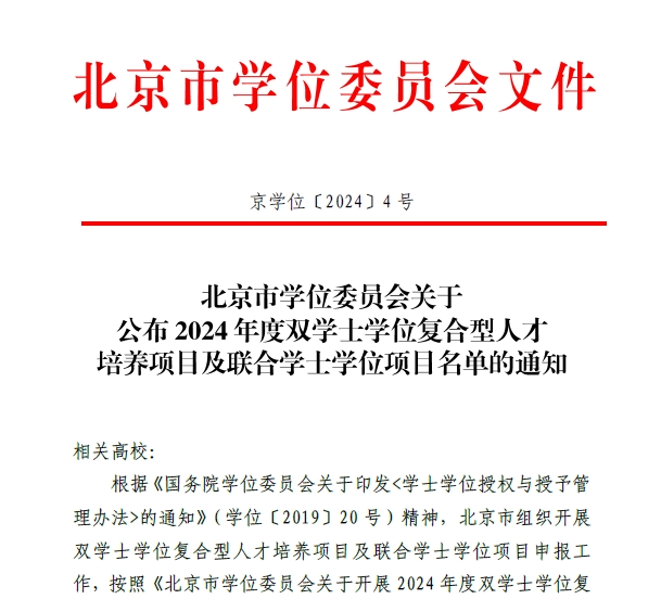 近日,北京市學(xué)位委員會(huì)公布了2024年度雙學(xué)士學(xué)位復(fù)合型人才培養(yǎng)項(xiàng)目及聯(lián)合學(xué)士學(xué)位項(xiàng)目的審批結(jié)果,我校申報(bào)的2個(gè)雙學(xué)士學(xué)位項(xiàng)目全部成功獲批,實(shí)現(xiàn)學(xué)校本科創(chuàng)新人才培養(yǎng)模式上的突破。