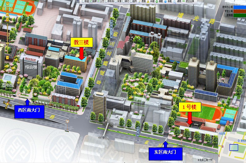 學校阜成路校區位于西三環航天橋東北角,具體地點及行車路線請登錄北京工商大學網站(www.pfcake.com)學校概況欄中“學校導游”部分;校園內樓宇分布如下圖所示或登錄“虛擬校園”查看(3dmap.btbu.edu.cn,其中東區1號樓顯示為學生公寓1)。