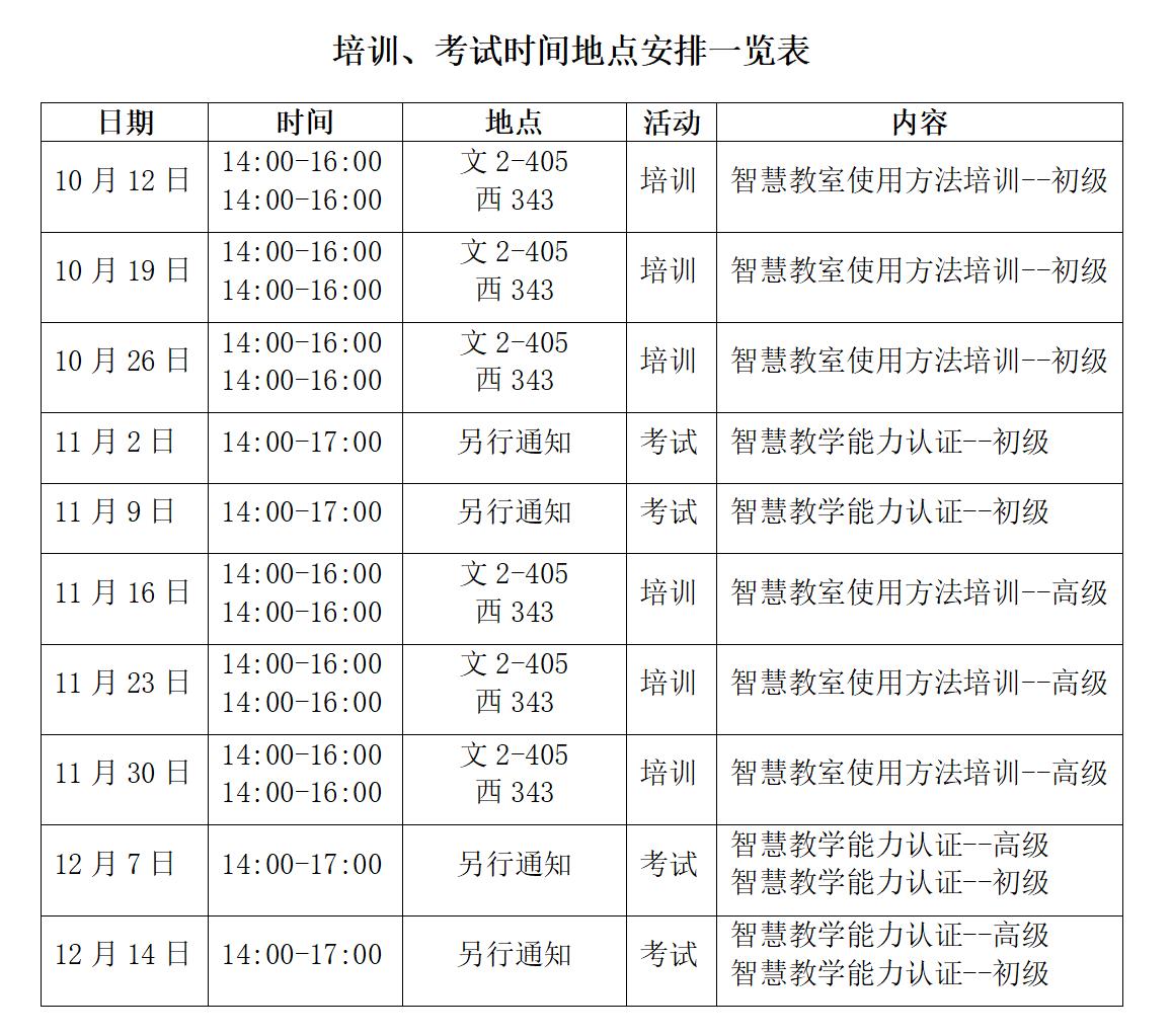 培訓定于每周三下午開展,初級培訓共計6場,良鄉校區3場、阜成路校區3場;高級培訓共計6場,良鄉校區3場、阜成路校區3場;初級能力認證考試共計8場,良鄉校區4場、阜成路校區4場;高級能力認證考試共計4場,良鄉校區2場、阜成路校區2場。