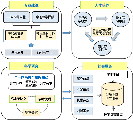 經濟學院緊密圍繞國家和首都經濟社會發展需求,以重點學科建設為導向,推動學科交叉融合,強化應用研究與基礎研究的結合,致力于為行業和區域發展提供服務。學院依托“一體兩翼”學科群建設方案,以數字金融為“頭雁”,以數字經濟和數字貿易為“兩翼”,“雁陣式”推進應用經濟學學科群建設,并整合學院優勢資源,打造相應學科團隊。在全院師生的長期共同努力下,學院的標志性科研成果、高級別科研項目、橫縱向科研經費持續增長。
