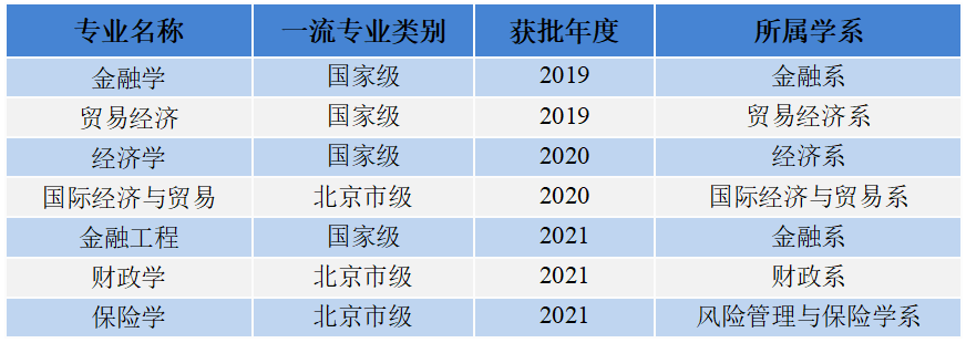 經濟學院擁有國家級一流本科專業建設點4個,北京市級一流本科專業建設點3個,戰略新興專業2個。2018年應用經濟學獲批一級學科博士學位授權點,2019年獲批應用經濟學博士后科研流動站,應用經濟學入選北京高校高精尖學科建設項目,實現高等教育人才培養全層次覆蓋。