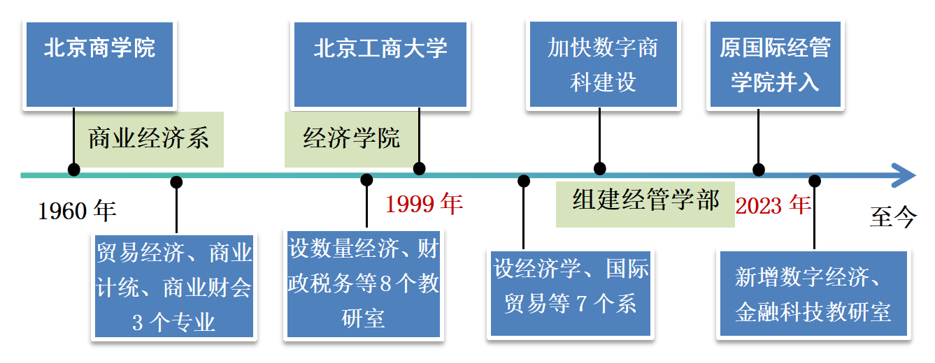北京工商大學經濟學院起源于原北京商學院商業經濟系。1960年開始招收本科生,1981年成為全國首批碩士學位授權單位,1997年被確定為原國內貿易部重點學科單位。1999年6月,北京工商大學經濟學院成立。2023年,原國際經管學院的數字經濟系、金融科技系并入經濟學院。